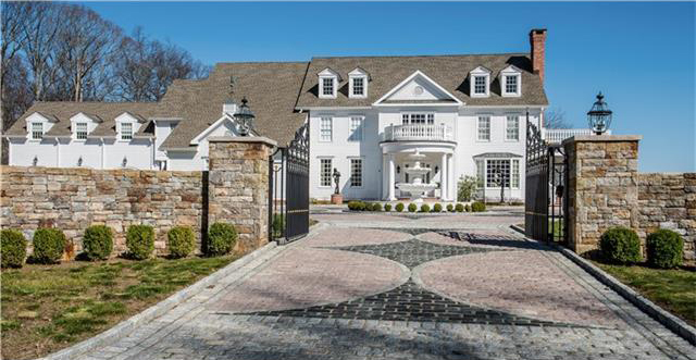 A gated driveway leads to the elegant Georgian Colonial home.