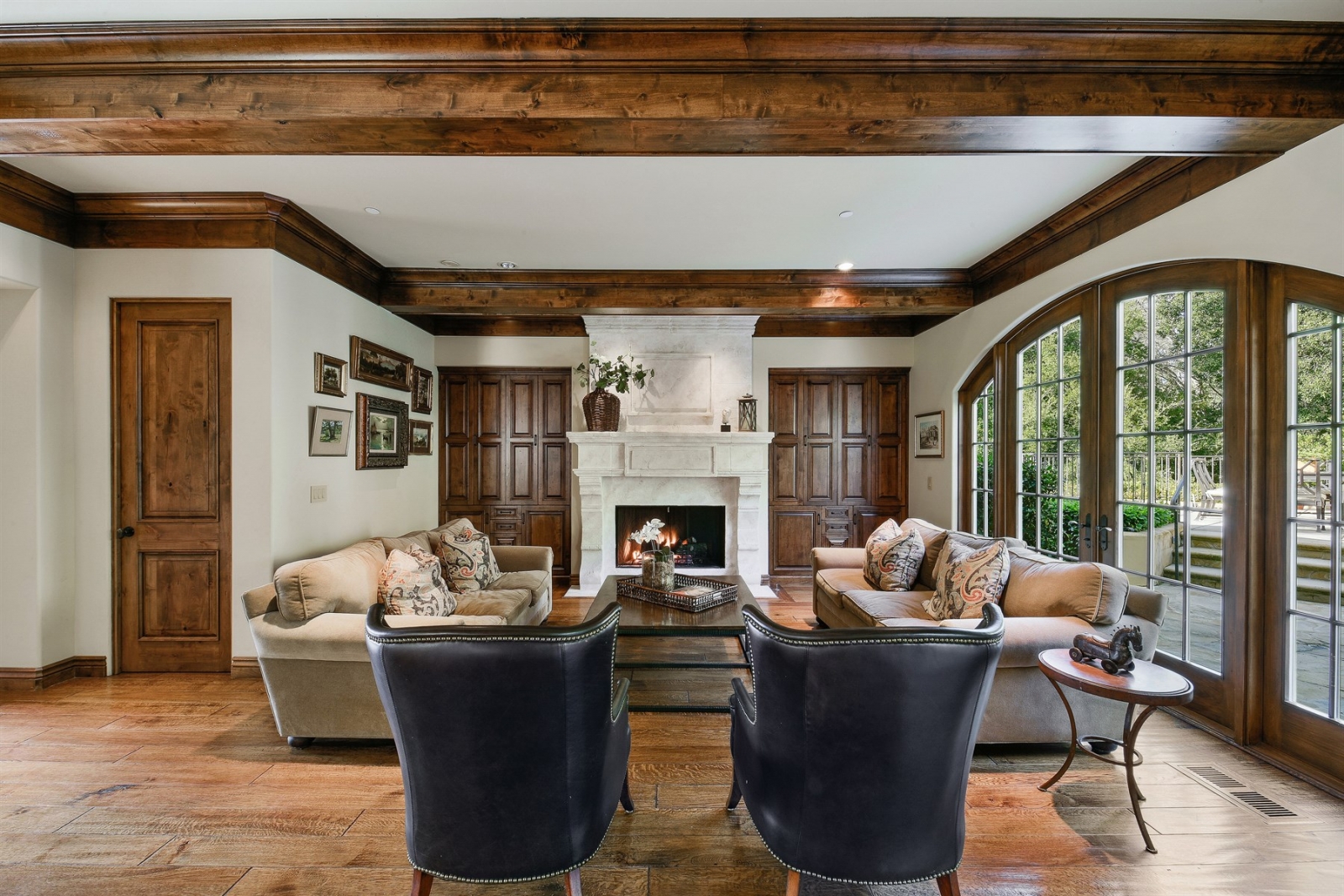 French doors in the living room connect the indoor and outdoor spaces.