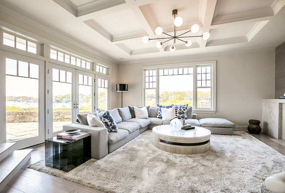 The light-filled living room features a coffered ceiling and French doors to the patio.