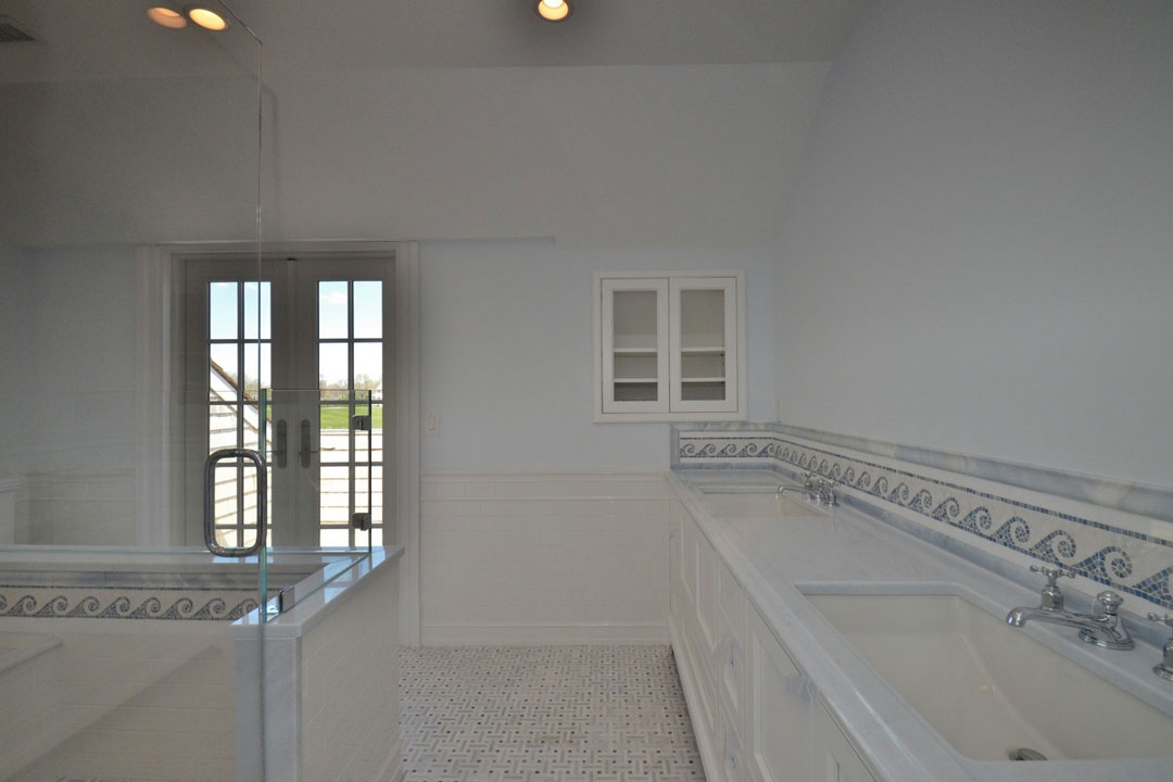 The master bathroom opens onto a balcony overlooking Long Island Sound.