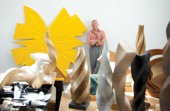 Every piece Youngerman makes is planned long before a brush touches the canvas or a saw or shaping tool meets a block of wood. “I have hundreds of little rough sketches, but they don’t jump immediately from paper to canvas,” says the artist, who has had recent shows at the Drawing Room in East Hampton and the Washburn Gallery in Manhattan, and whose majestic fiberglass and resin sculptures are on view in the exhibition “Black and White,” at LongHouse Reserve in East Hampton, until October 15.