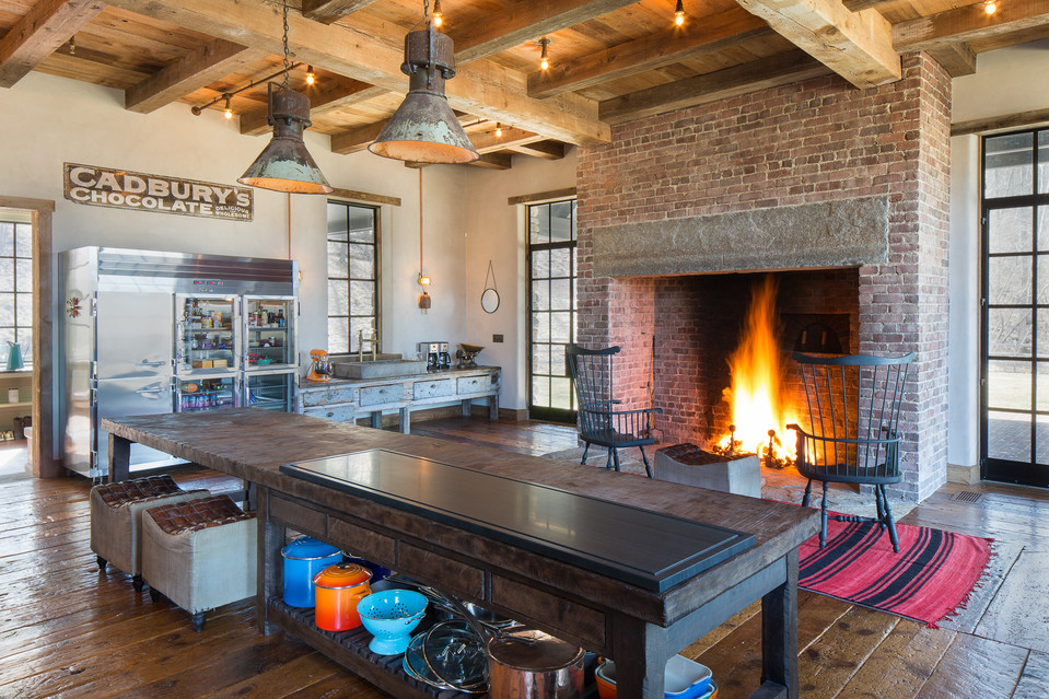 The eat-in kitchen features a grand fireplace and pizza oven.