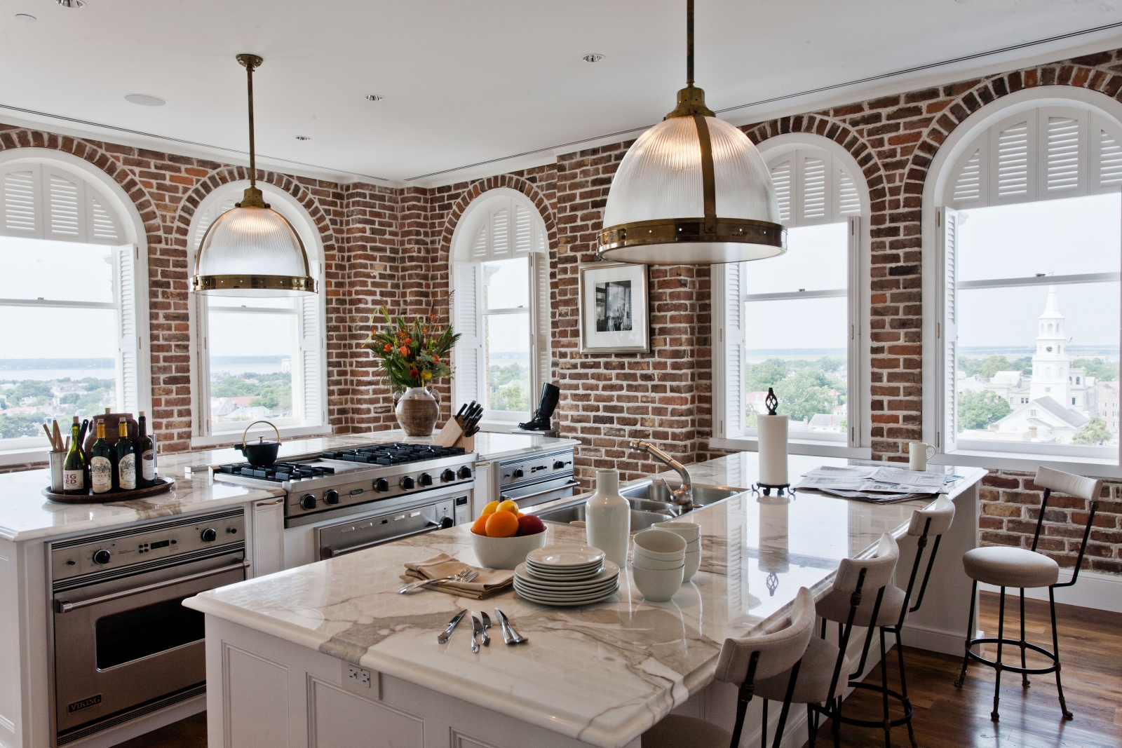 The gourmet chef’s kitchen features double islands, exposed brick and arched windows.