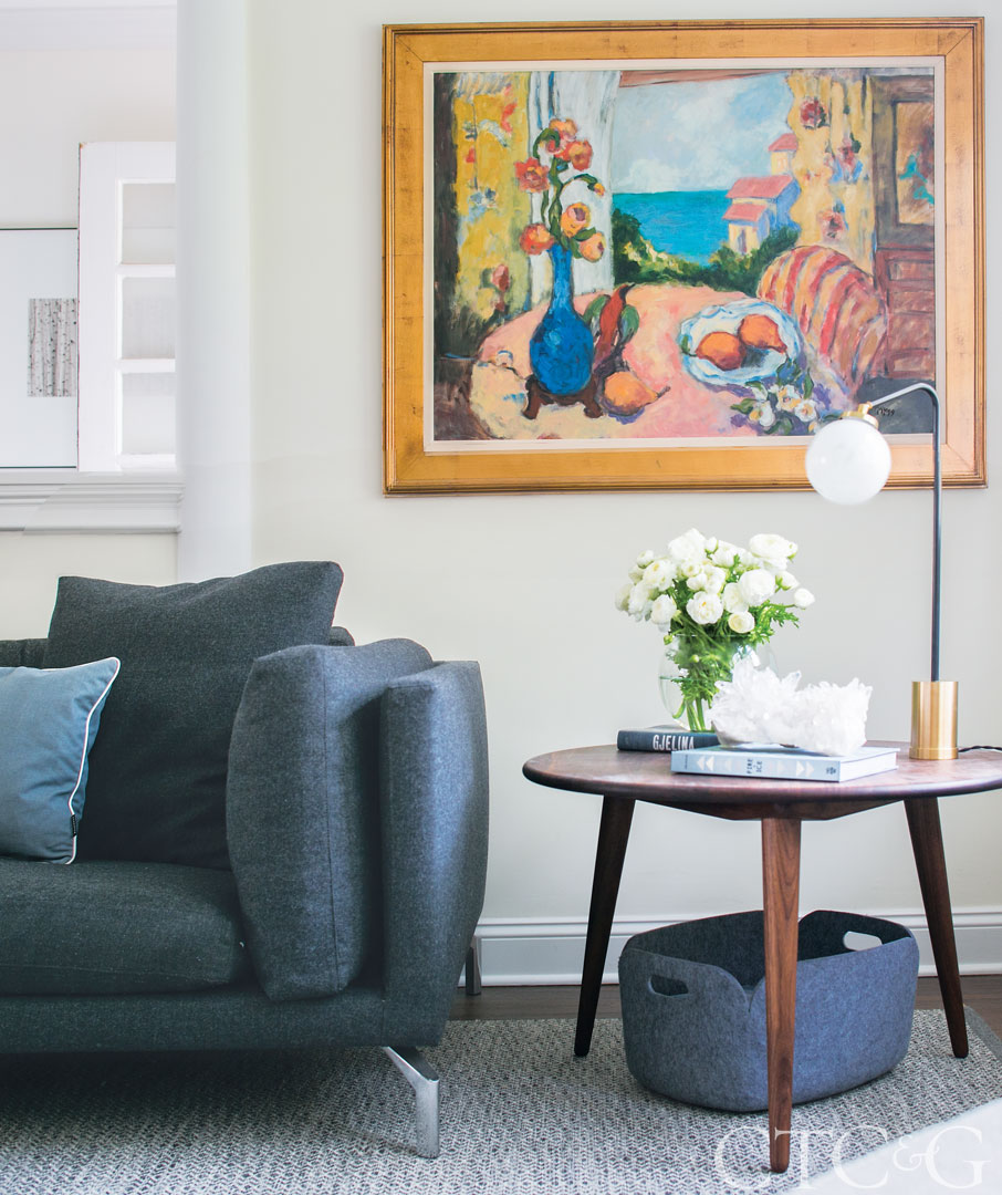 The conversation continues in the living room, where turn-of-the-century Danish giltwood sconces flank a tall 19th-century painted-pine clock and refer back to the dining room mirror. A Hans Wegner console and Saarinen womb chair are a nod to midcentury design; the sleek Como sofa in marled gray is a modern take on a traditional Gustavian hue. “The sofa is the anchor of the room, so it needed depth of color to ground the space,” says Eleish. One of Gate’s favorite pieces is a painting by artist Jim Seitz. “It’s called Treasure the Moment, and it’s a metaphor for what I’d hoped for in the apartment,” she says.