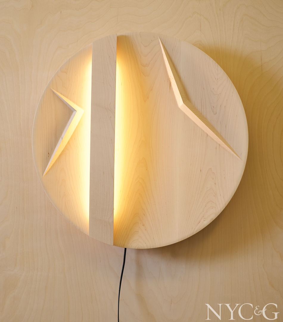 Hopkins and Boynton have since moved their operation into a communal studio in Long Island City, where they fabricate their case goods, lighting, and mirrors. One piece in their debut collection—unveiled during ICFF at the Javits Center in 2016—is the Gentle Disk pendant, featuring two wooden discs held in place by a curved brass frame. They begin the fixture with a large square of raw pine that’s machine-cut into an oval and beveled on one side. The wood is then hand-sanded, painted with a translucent white stain, and coated with wax. A fresh piece of pine, prepared the same way, comprises the pendant’s smaller disc, whose flat side is hollowed out to house an LED bulb (an acrylic lid diffuses the light). Next, Boynton and Hopkins bend a thin brass bar to form a circular-shaped frame, assemble the fixture, and attach a colorful cloth cord to conceal the electrical wiring. “We don’t do things the way they’re traditionally done,” says Boynton. “Finding elegant, novel solutions is our strength.”