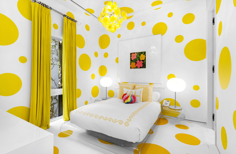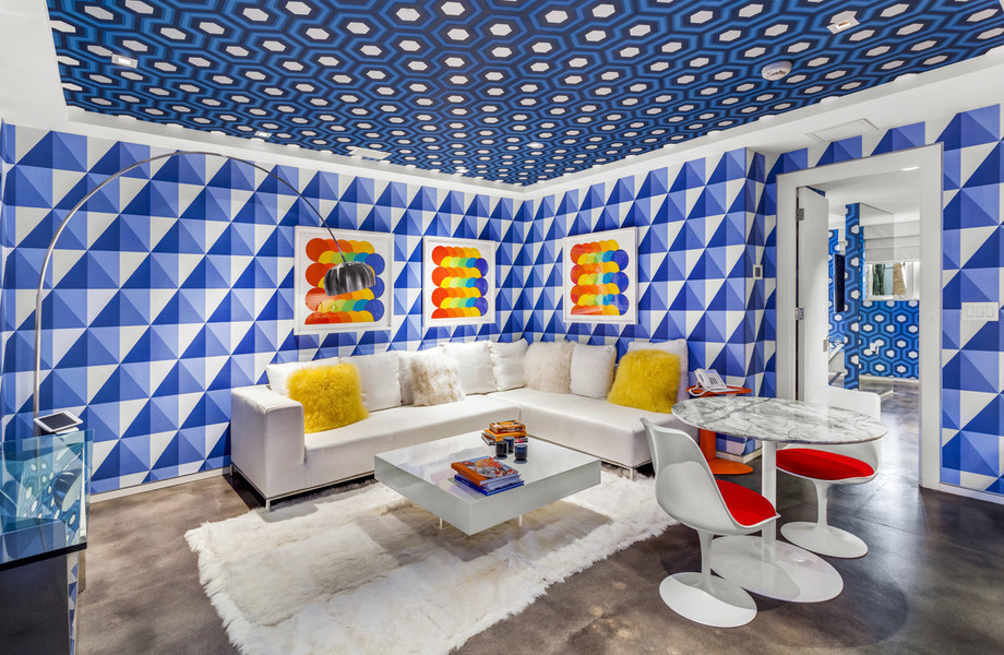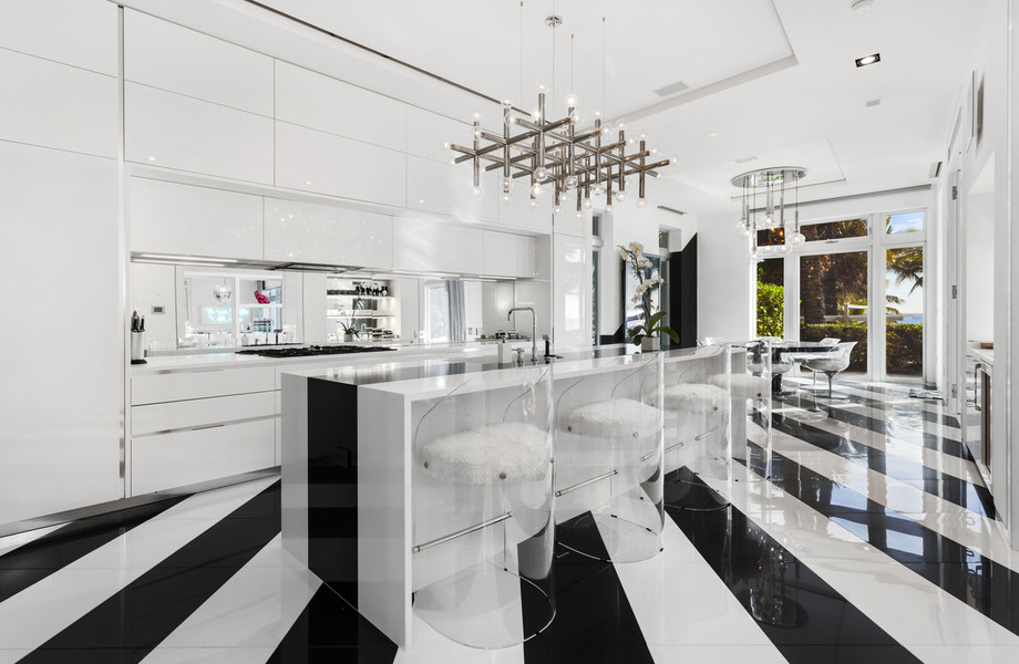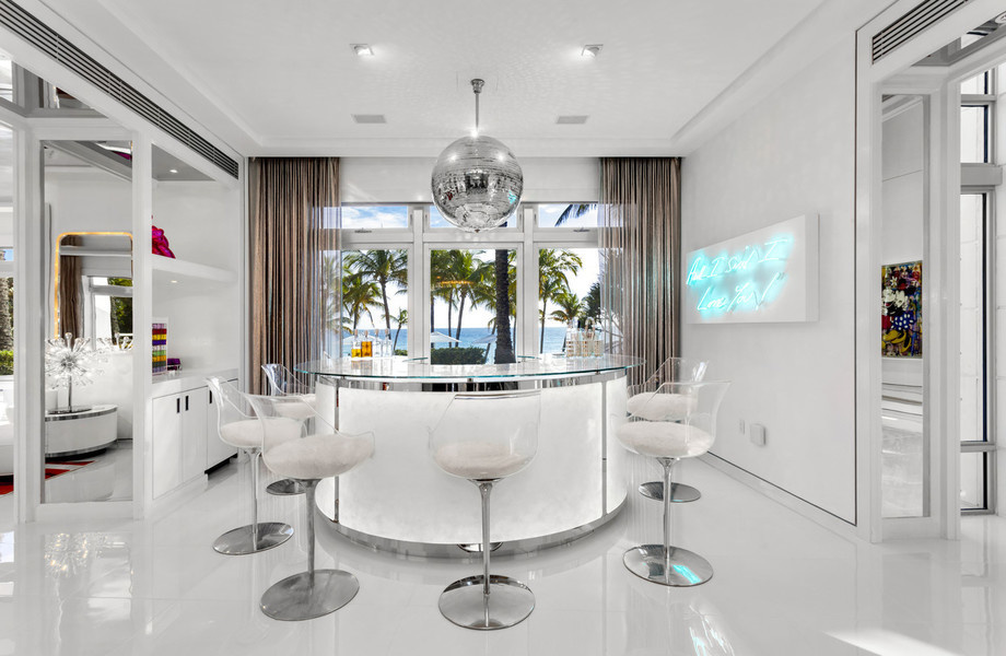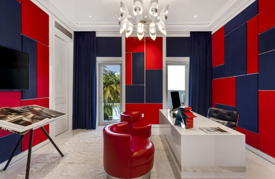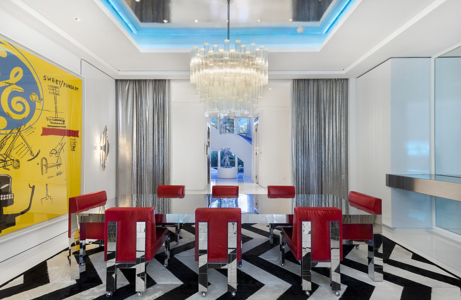 Tommy Hilfiger’s lavish style doesn’t stop with his Plaza penthouse. Mansion Global reports that he is looking to unload another over-the-top home, this one on Miami’s exclusive Golden Beach and listed for $27.5M with The Jills’ Jill Hertzberg and Jill Eber. Hilfiger and his wife, Dee Ocleppo, worked with Martyn Lawrence Bullard to outfit the entire 14,079-square-foot spread in bold colors and patterns and even included fruit-flavored scratch-and-sniff wallpaper in several of the bathrooms. A scroll through the listing photos reveals a liberal use of pattern and bright Pop and post-Pop artwork adorning nearly every wall. The professionally appointed kitchen gets a bold personality from its black-and-white striped floor while the office’s navy and red paneling pays homage to the Tommy Hilfiger brand. Selections of the furniture and art are available, should the buyer be interested, for an additional price. While the interior is somewhat singular in style, the grounds are universally enjoyable, featuring an oceanfront infinity pool and private beach access.