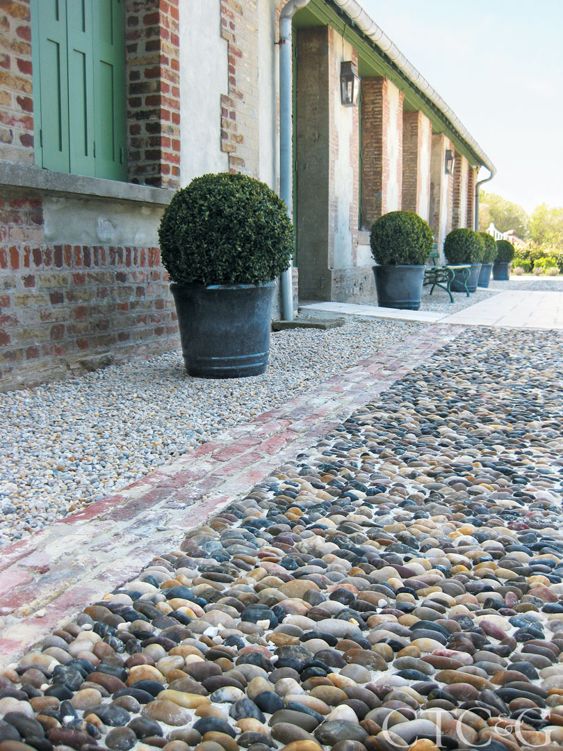 The solution lay in strong lines and a no-nonsense entry drive accented by yew cones and boxwood edging.
