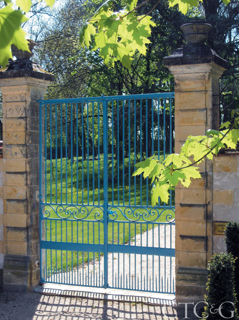 Not only did the gate move to the fore, but it received a fresh coat of French blue paint, while its piers were taken down, numbered and reinstalled. To achieve the Old World patina on the new wall, it was preserved with a tile cap and plastered with a lime wash.