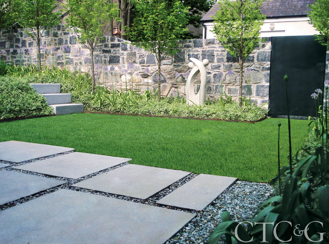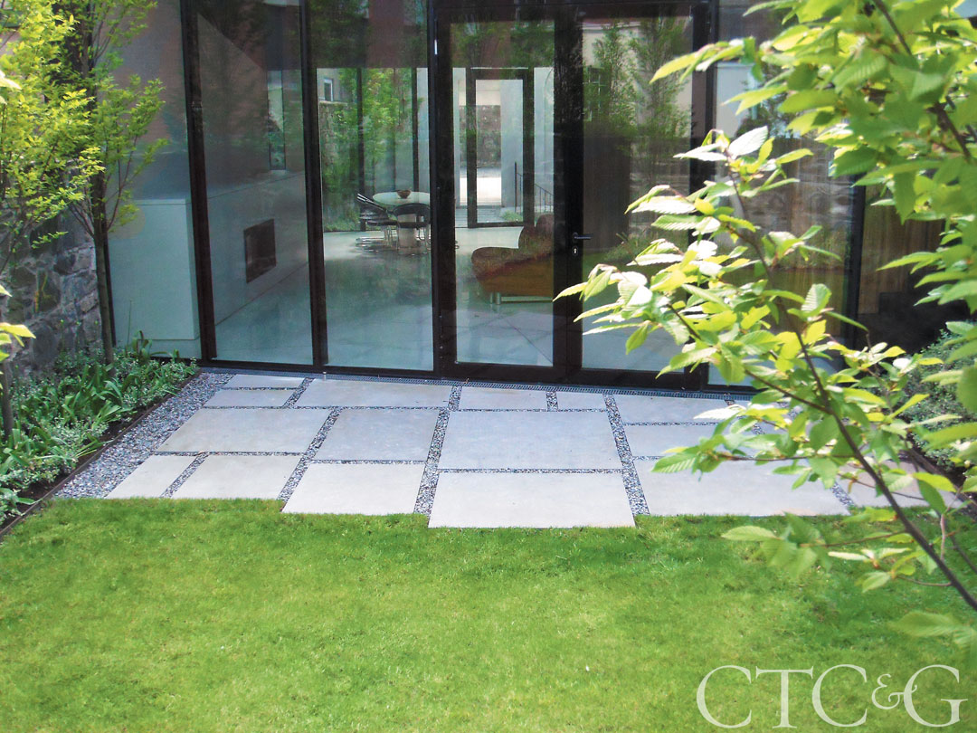 The sole nod toward lawn is in the rear garden where irregular paving echoes the modern motif.