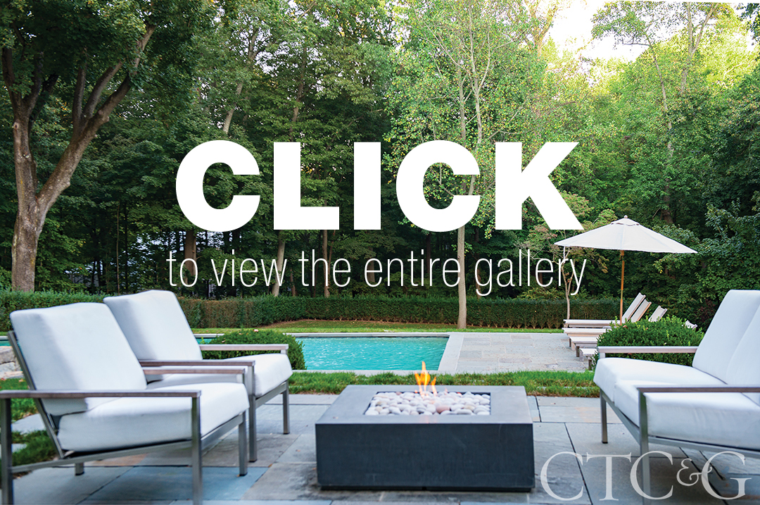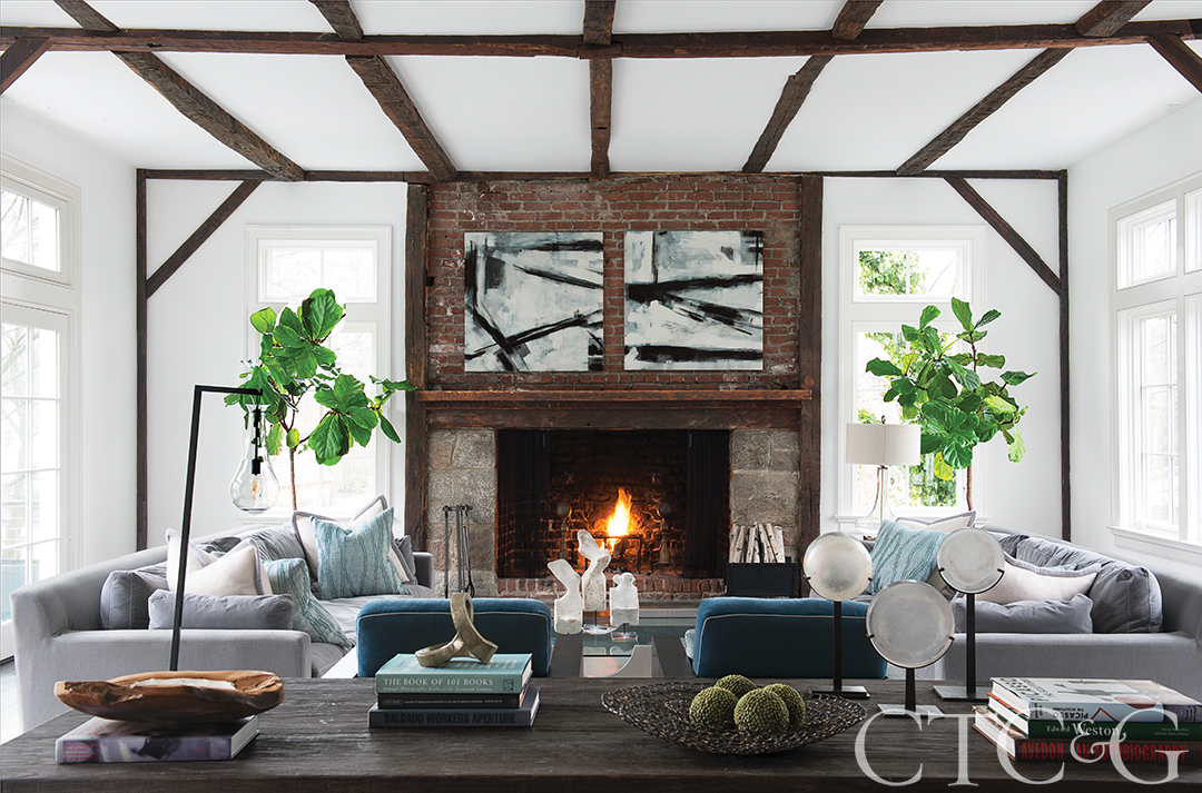 That philosophy is evident everywhere including the living room where a pair of sofas cloaked in soothing gray velvet face off across a similarly toned coffee table, while a shag rug welcomes bare feet. “I didn’t want to do white, which is so prevalent in Connecticut and, besides, gray is cozier,” says Marshman, noting everything including the pleasing neutral palette with hints of blue suits the casual style of the homeowners. “They are very stylish people, but they wear blue jeans for any occasion.”