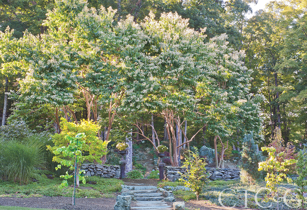 Similarly, stewartias form their camellia-like white blossoms in the heat of season. Although perennials are not big on his want list, he carpets areas with low-maintenance groundcovers such as sedum. Plus he travels around, hunting up woody wonders to add to the exhibition.