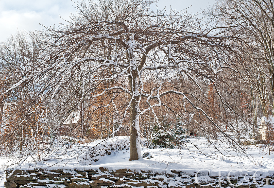 Not only is winter when all the carefully wrought stonework steps out to define spaces, but the trees make this scene statuesque. There’s something about stone and woody trunks and branches that is heart-arresting. But again, Nixon hasn’t left this to chance. He has sculpted his trees into forms—parasols, weeping forms and vase shapes—that are particularly head-turning when stripped of leaves and etched in snow or ice. Proper open pruning ensures that revered rare trees will not succumb to snow load. He also selects trees specifically for their winter interest with exfoliating bark and intriguing trunk coloration high on the list of virtues necessary to qualify for inclusion in the property of a confessed tree snob. That said, birches need not apply. “Too short-lived,” he decrees. But still, many trees that you never met before are welcomed here. Hint: These same performers might be apropos for your little kingdom. With very little provocation, he’ll hand you a long list that correlates with the meticulously labeled specimens in his domain. For seasons of splendor aloft, do try this at home.