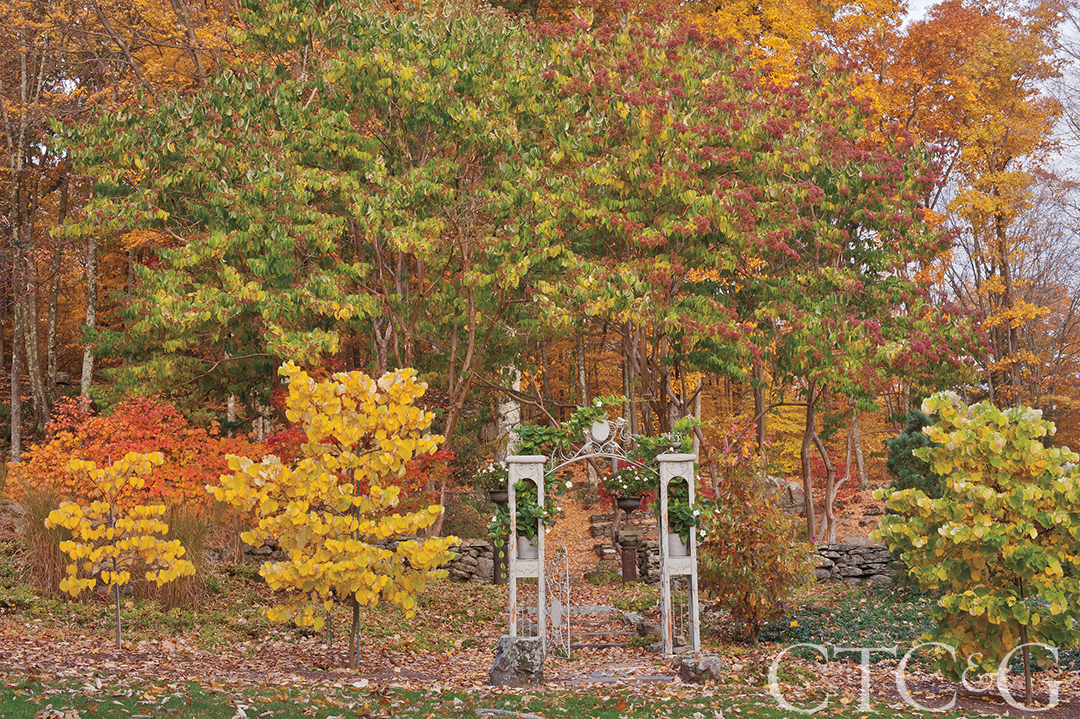Even combined with kin, individuals from different sources have slight variations in fall color leading to a sublime display. And importantly, trees are always given plenty of breathing room to accent each element. “Spacing is the almighty,” says Nixon. “Think of the span, not just the height.” Fall is also when newly installed trees shine as smaller additions show their true autumn colors. Nixon generally plants fledgling trees—primarily because the varieties he obtains are rare and he’s on a waiting list. Surveying the scene from his high altitude, the colorful background makes his homeground efforts all the more ravishing. Distant trees offset the bounty in residence.