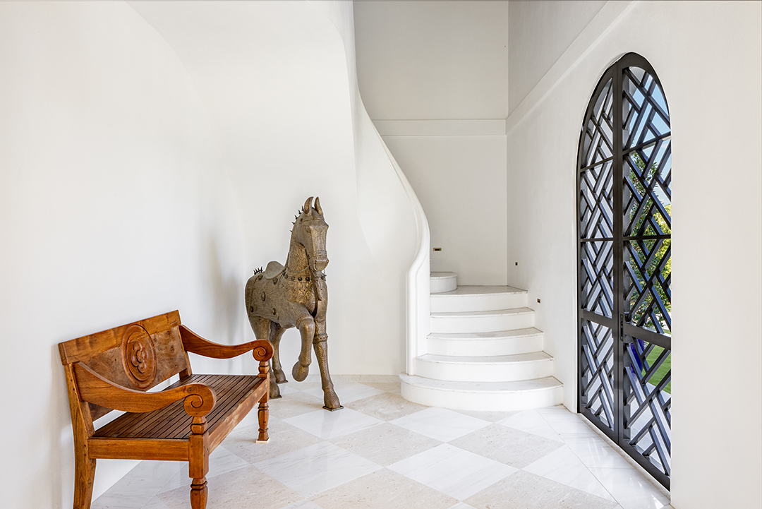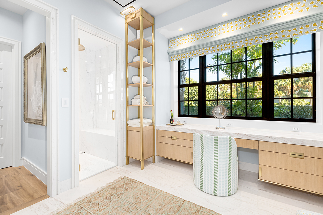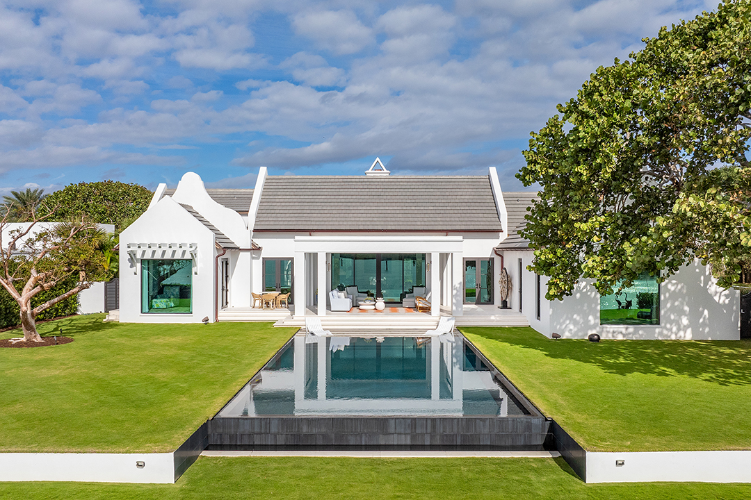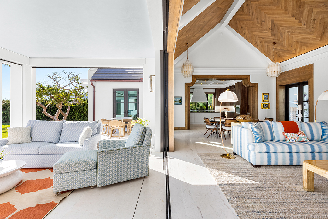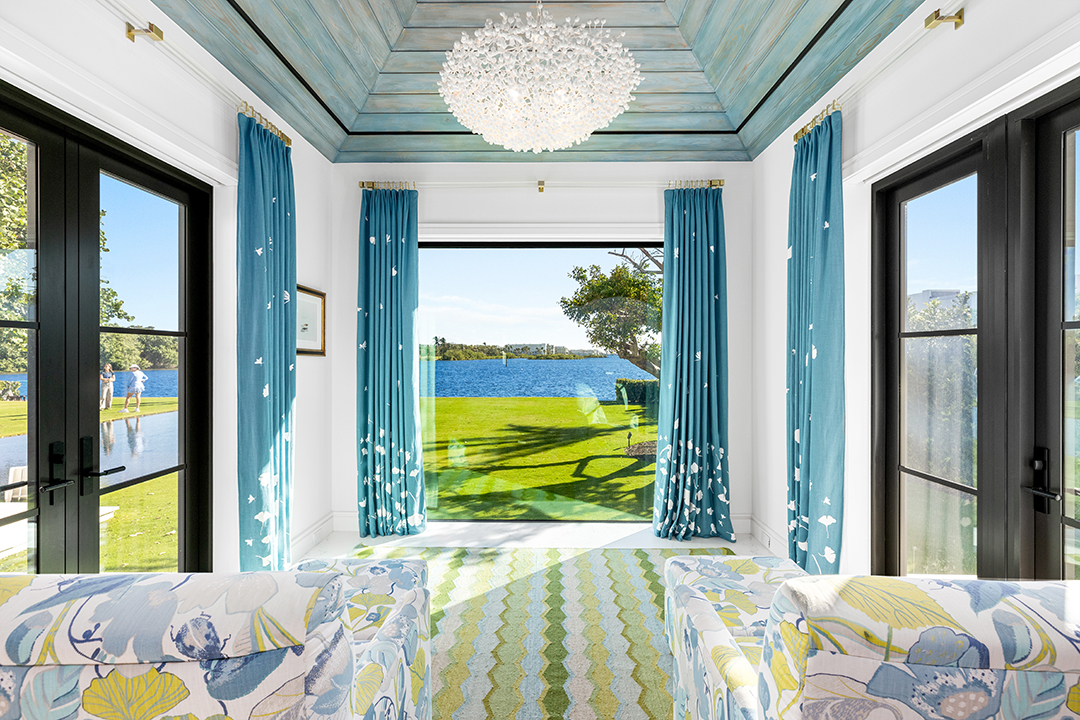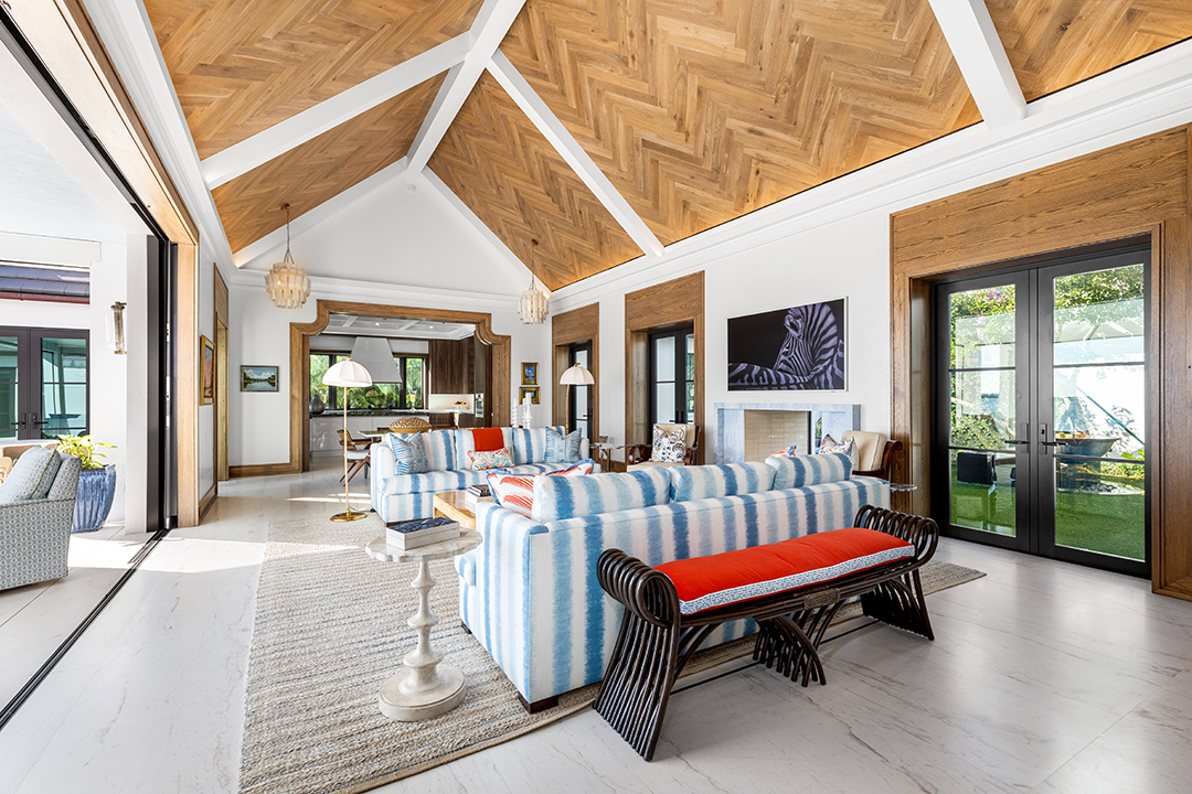 Mark Albright of Albright Construction completed the home in 2023, with the breathtaking interiors crafted by Lillian Fernandez Interiors. The front exterior features exuberant blues that contrast against the white walls while the rooms inside exude a mix of fashionable contemporary flair and traditional island elegance. The living room boasts striking woodwork and soaring high vaulted ceilings. It has a huge glass wall that opens up entirely, leading out to an infinity pool and spacious lawn overlooking the turquoise water. Does it get more indoor-outdoor living, Palm Beach posh than this?