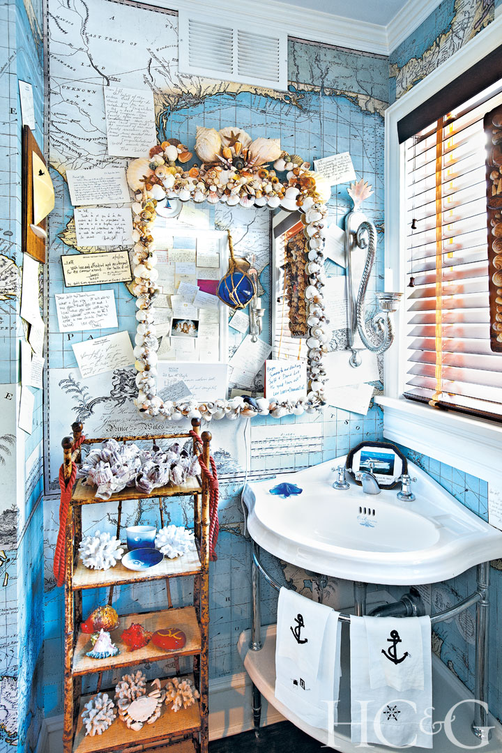 A mélange of shells and notes left by friends surround a mirror by designer Jan Hamill in the sea-themed powder room.