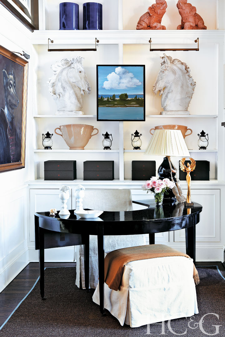 Two equine busts from Homenature frame a Barbara Sloan painting from Mark Humphrey Gallery in a corner of the living room.