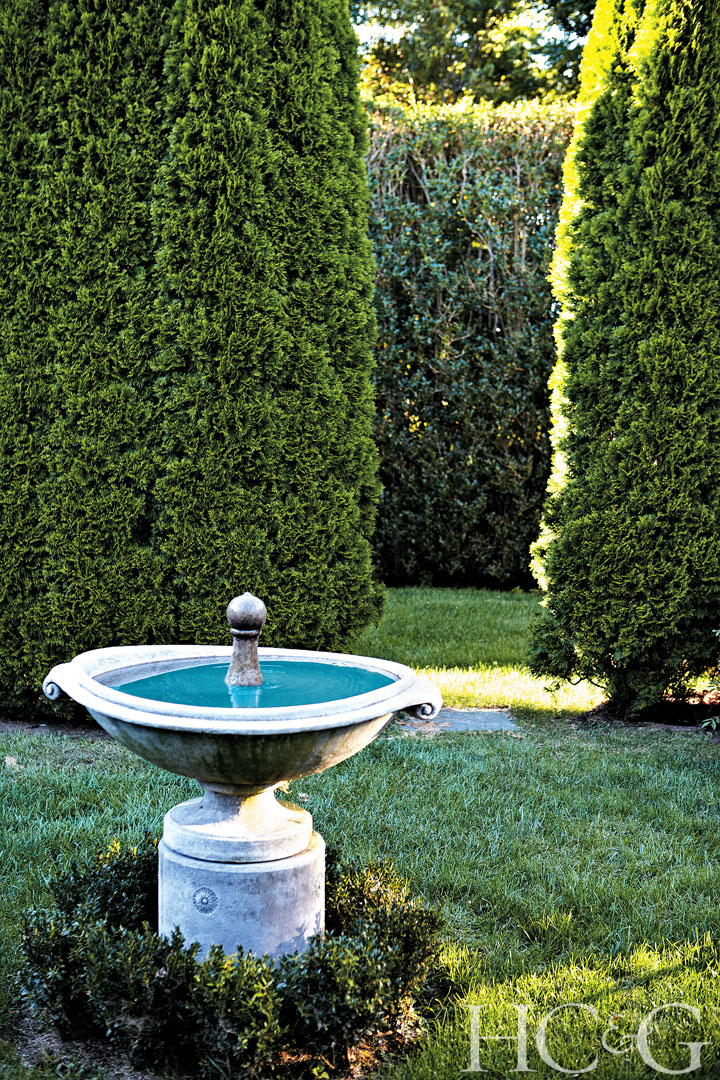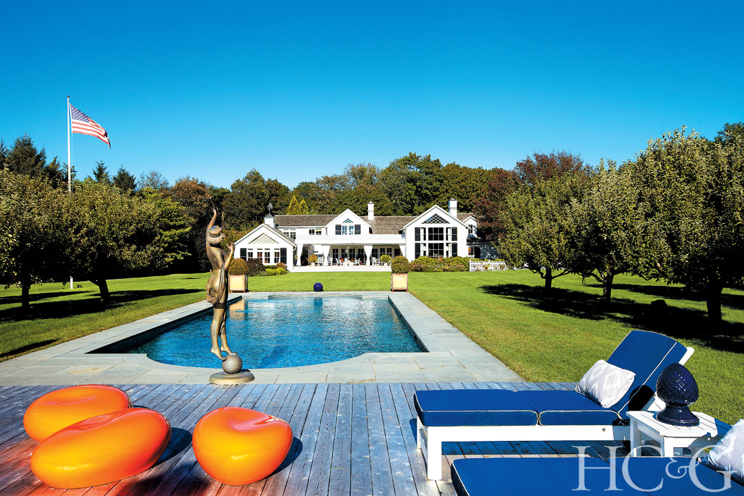 In the backyard, a bronze fountain depicting Diana the Huntress sits at the foot of the pool, which is flanked by apple tree allées. The lounge chairs are from Weatherend Estate Furniture.