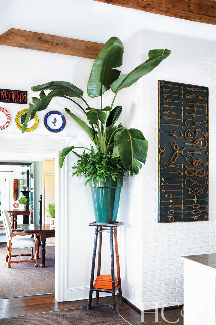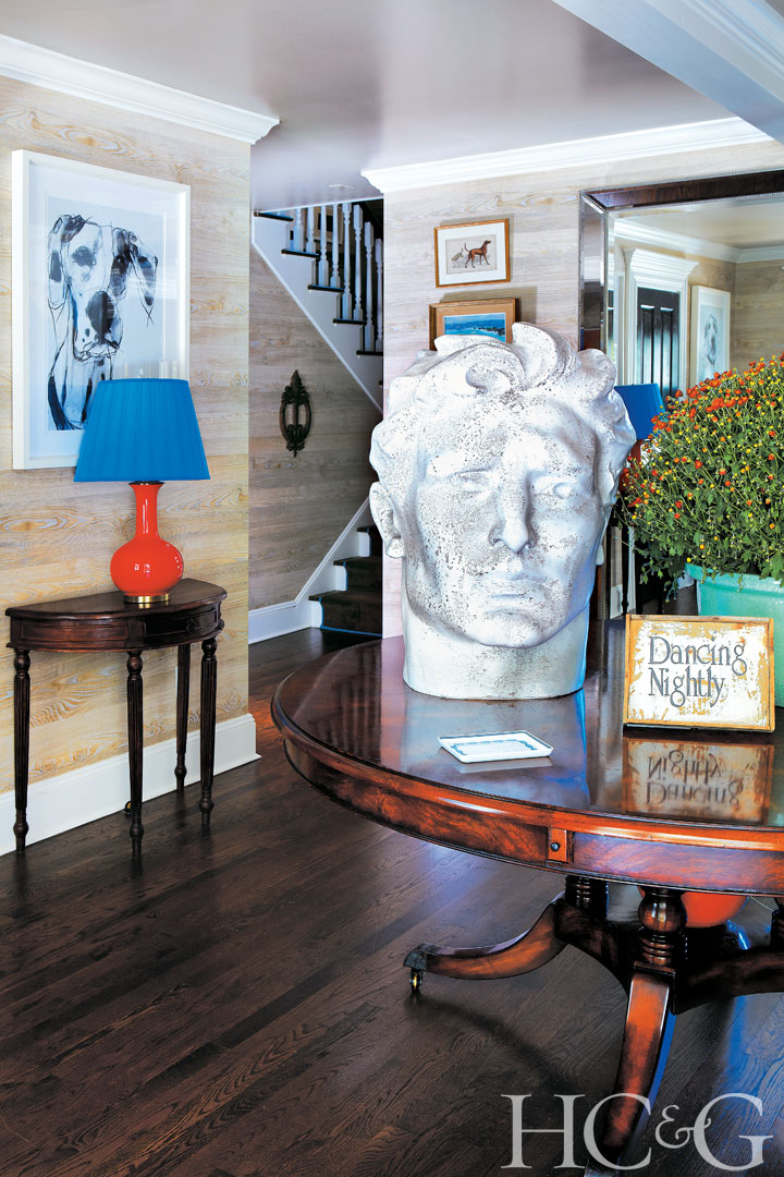 In the foyer, three framed Hermès scarves, highlighted by playful orange balls from Lynch’s Garden Center, top a sofa by interior designer Tom Samet; the accent tables are from John Rosselli.