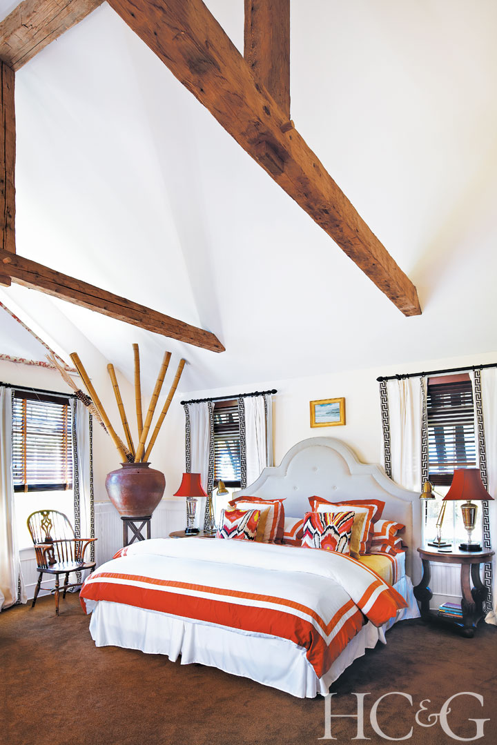 Williams-Sonoma Home bed linens, accented in orange and red, warm up the master bedroom. The matching shades are from Oriental Lamp Shade Company; the large urn is from Lynch’s Garden Center.