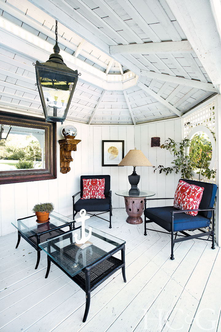In the gazebo, a Jonathan Adler anchor sits atop one of a pair of glass coffee tables found at a Paris flea market; the wrought-iron chairs are from Frontgate.