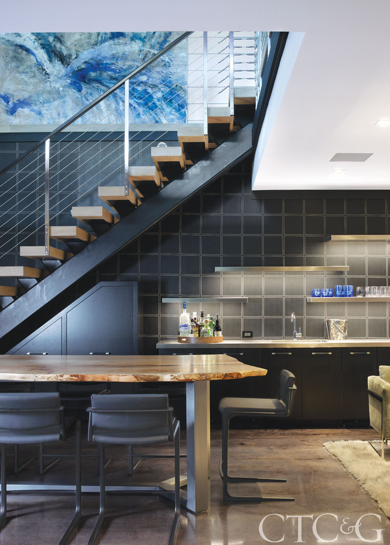 The leather for the bar backsplash is from Donghia. A counter-height, live-edge wood table designed by Brooks is the perfect spot for grabbing a bite between activities. Stairs are from New England Stair Company.