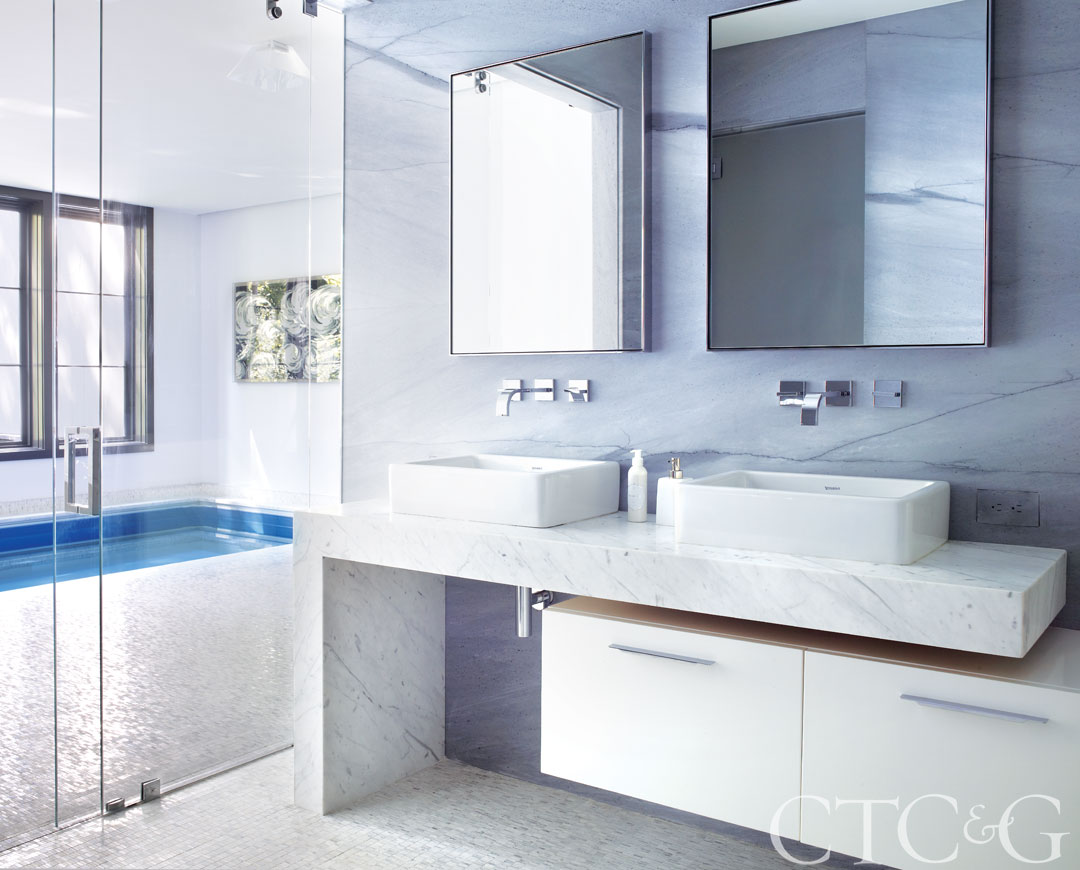 A vanity area outside the pool features matching Duravit sinks and Dornbracht faucets. The custom cabinets are by Highland Woodcraft.