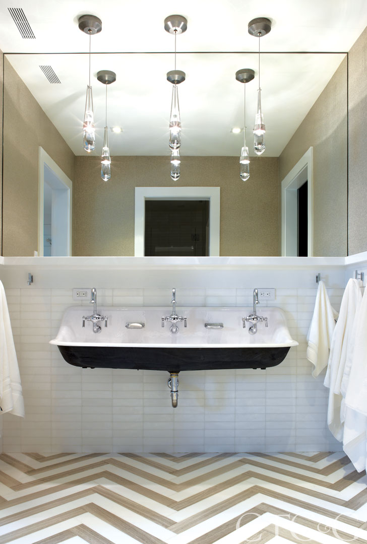 The bathroom has an oversized Kohler sink, mixed Thassos marble tile floor from D&D Homes, and Hubbardton Forge lighting.