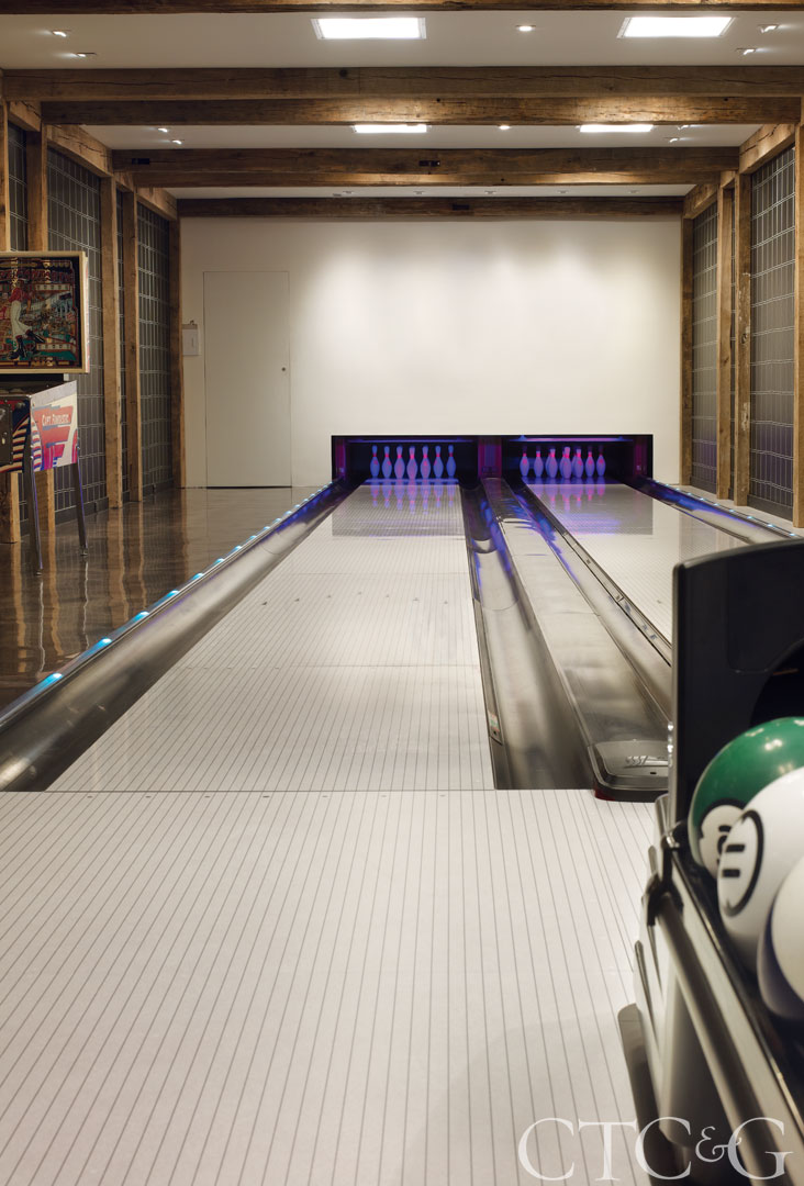 The leather for the bowling alley walls is from Donghia and the lanes are from Brunswick Bowling.