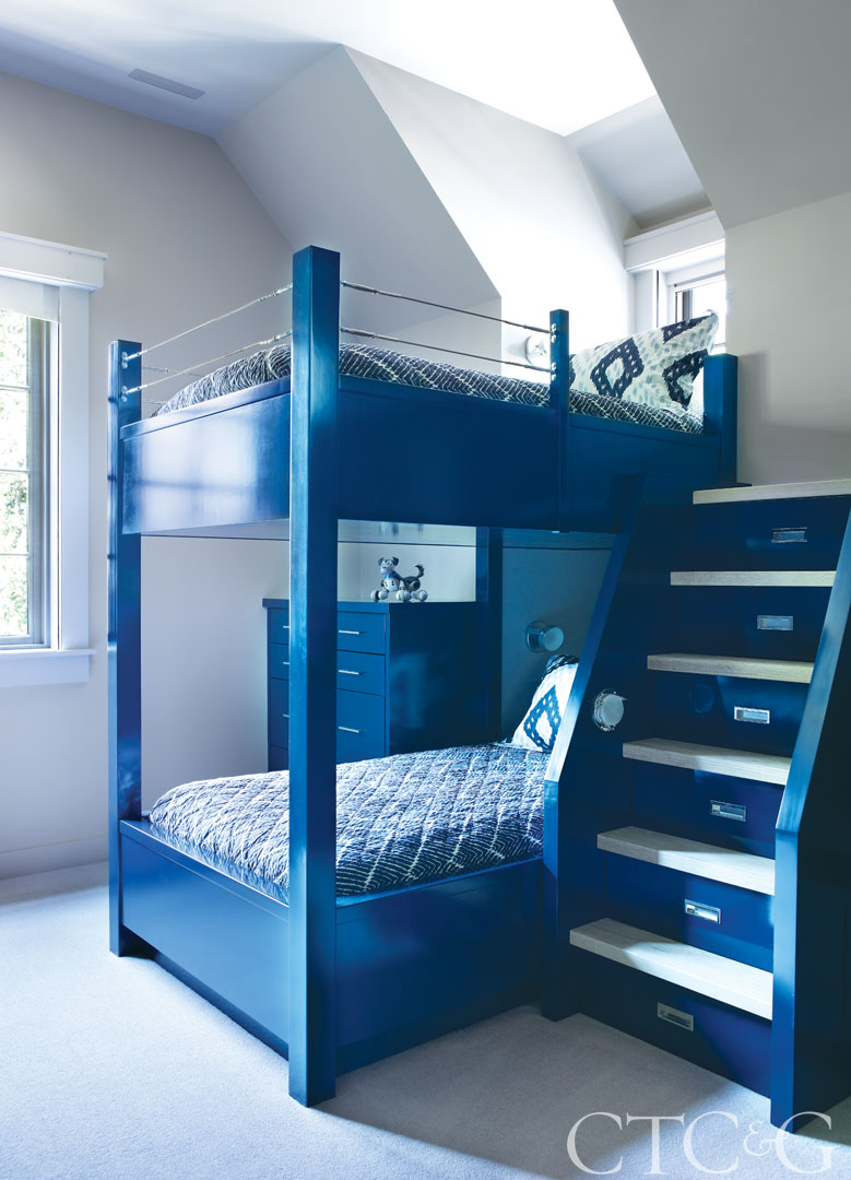 Bunk beds designed by Brooks were fabricated by Highland Woodcraft and painted in Ralph Lauren Club Navy. John Robshaw Textiles bedding is through the Linen Shop.