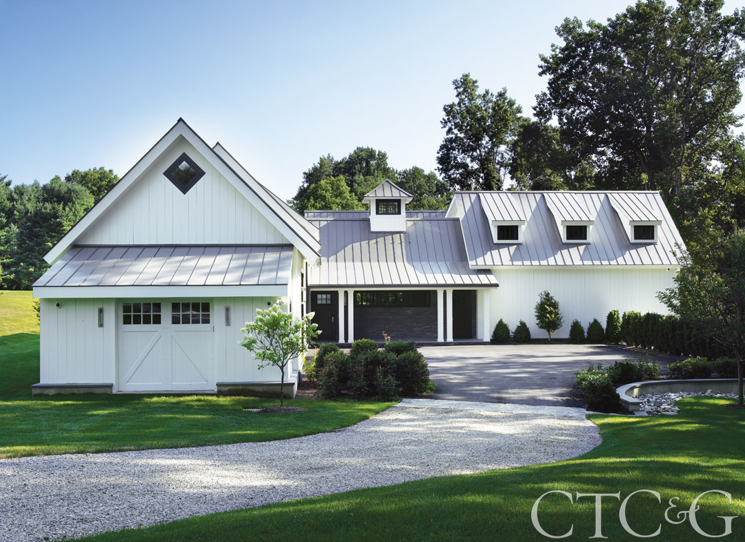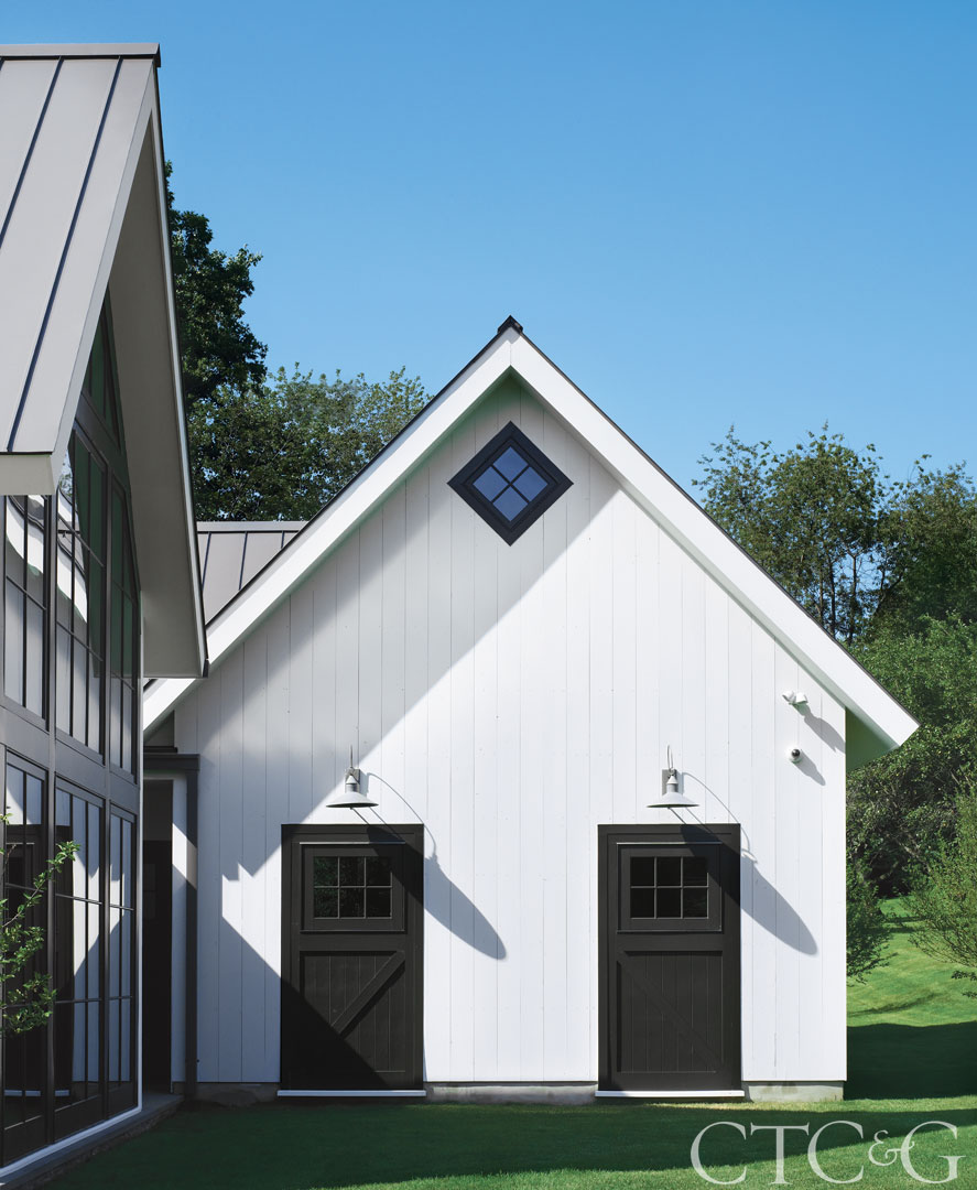 On approach, the farmhouse references, such as traditional horse stall doors and the pitched metal roof, are evident, and typical materials, like stone and wood, are employed but with a modern interpretation. “The stone veneer on the front porch is a contemporary linear bluestone, and the siding is a smooth tongue-and-groove vertical board as opposed to more textured clapboard,” notes Brooks. The expanses of charcoal windows that enclose the batting cage are another contemporary interjection. “The high contrast of the white siding, gray metal roof and dark windows give it a very modern feel,” adds Kelly.