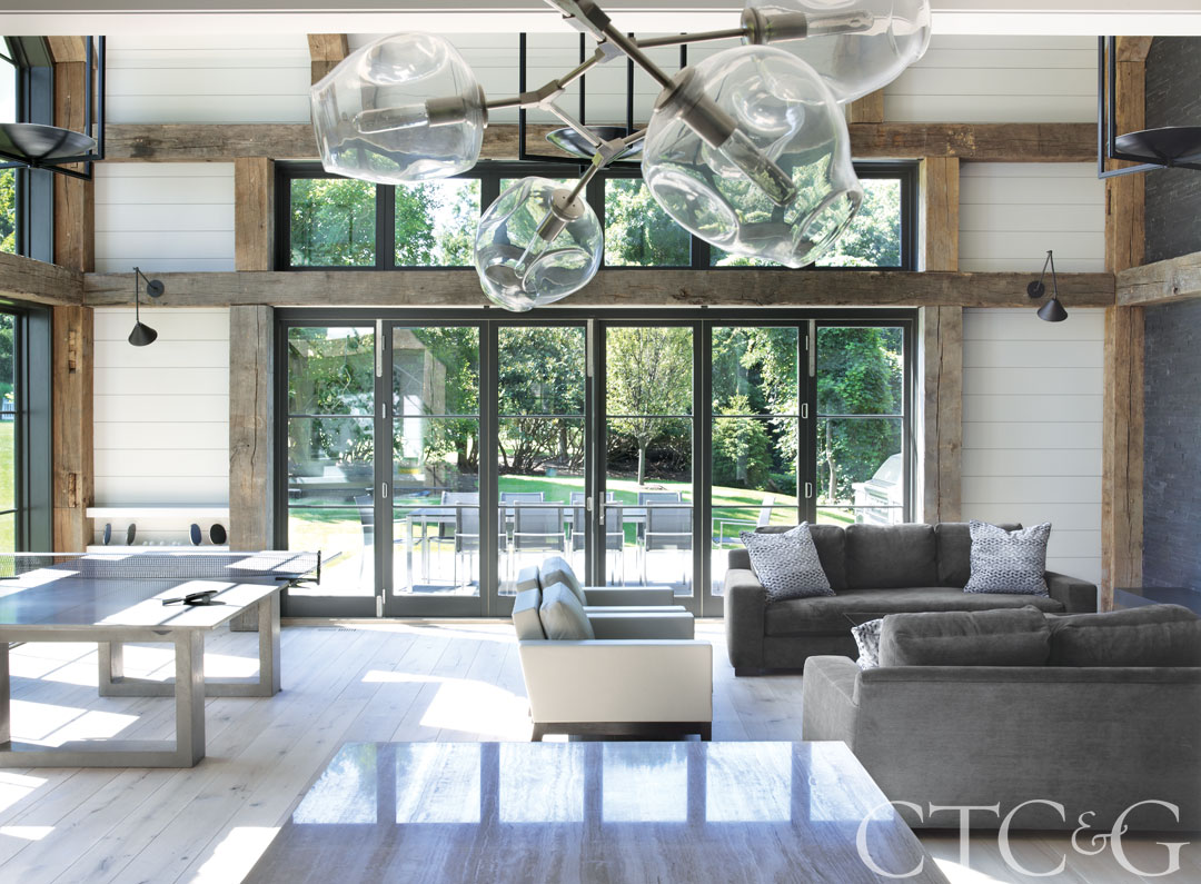 Rustic beams from Southend Reclaimed frame Kolbe & Kolbe Millwork windows in the game room.