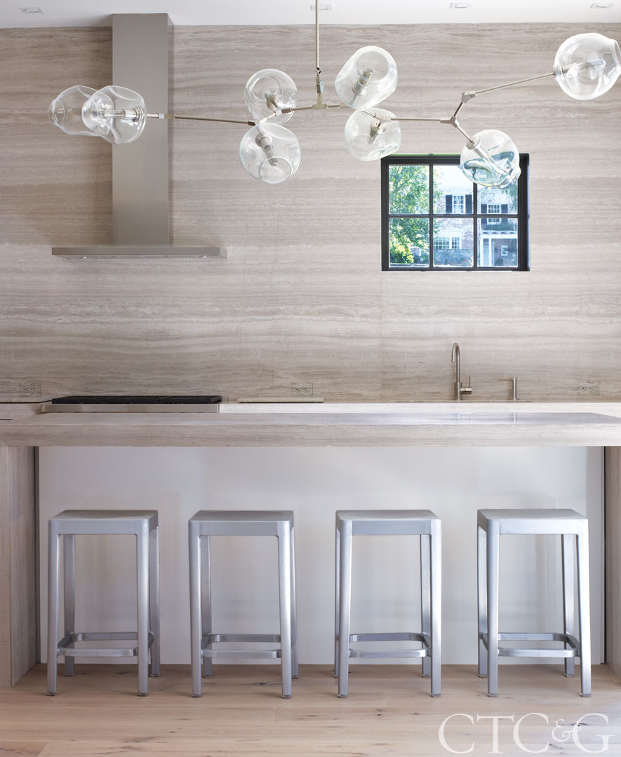 An eight-globe bubble chandelier by Lindsey Adelman adds spark to the neutral travertine backsplash and countertop in the kitchen. Faucet is Dornbracht; stove hood by Best.