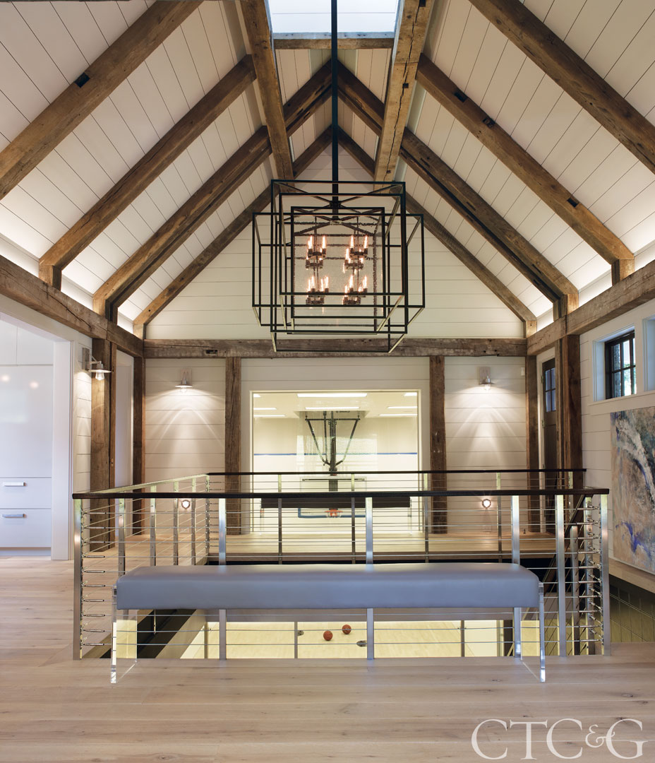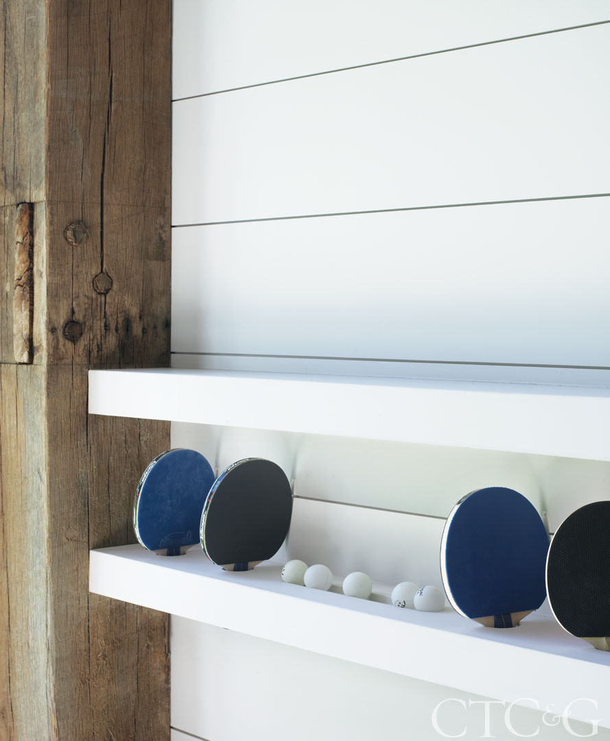 But before there was a recreational center with enough activities to rival a summer camp roster, there was just a stretch of land located down a 30-foot slope from a brick Georgian Colonial. The owners, who wanted the Field House to have a more casual flavor, also requested that the structure not dominate the landscape. So rather than mimic the traditional architectural lines of the main house, Brooks responded with a modern farmhouse designed in a pinwheel pattern meant to minimize the scale of the building. “It’s three stories high, but thanks to the slope and the pinwheel design, at any given angle, you can only see 50 percent of the building,” explains Brooks.