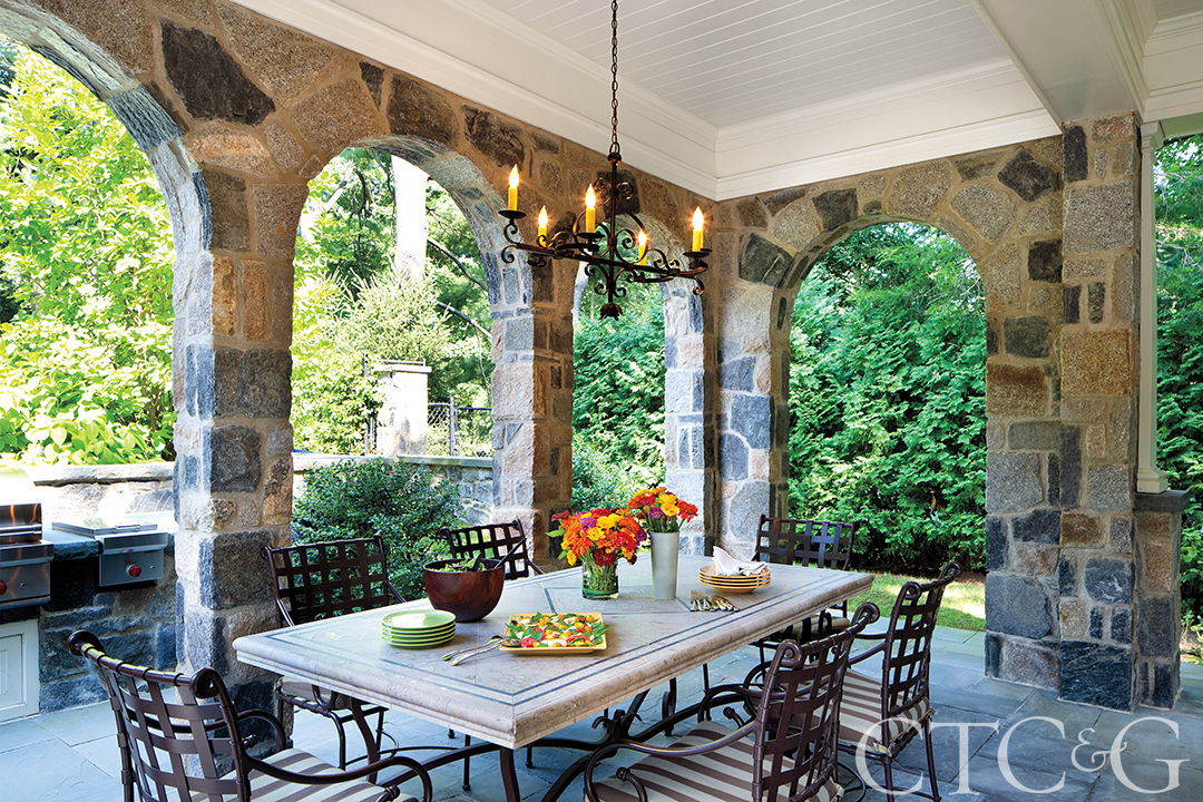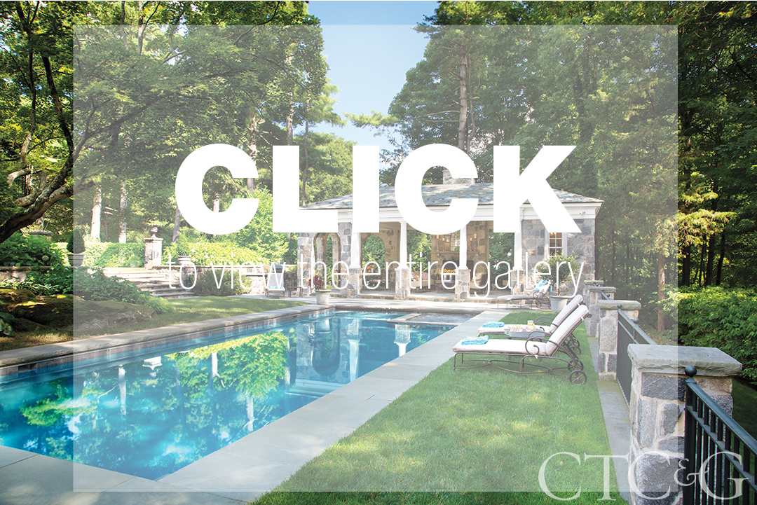 Both Wadia and Cummin had the will and fortitude to make sure it survived. During the building process, they hired an expert arborist to cut back the branches, and feed and water the tree regularly. “I think the tree is what makes the pool, design-wise,” says Wadia. The other prominent element on the bucolic grounds is the stone pool house. Its Georgian-Colonial form and vigorously textured stone surfaces mimic the house, a structure situated some 150 feet away. “They wanted the pool house to be a sanctuary apart from their main sanctuary,” is how Wadia describes the clients’ design directive.