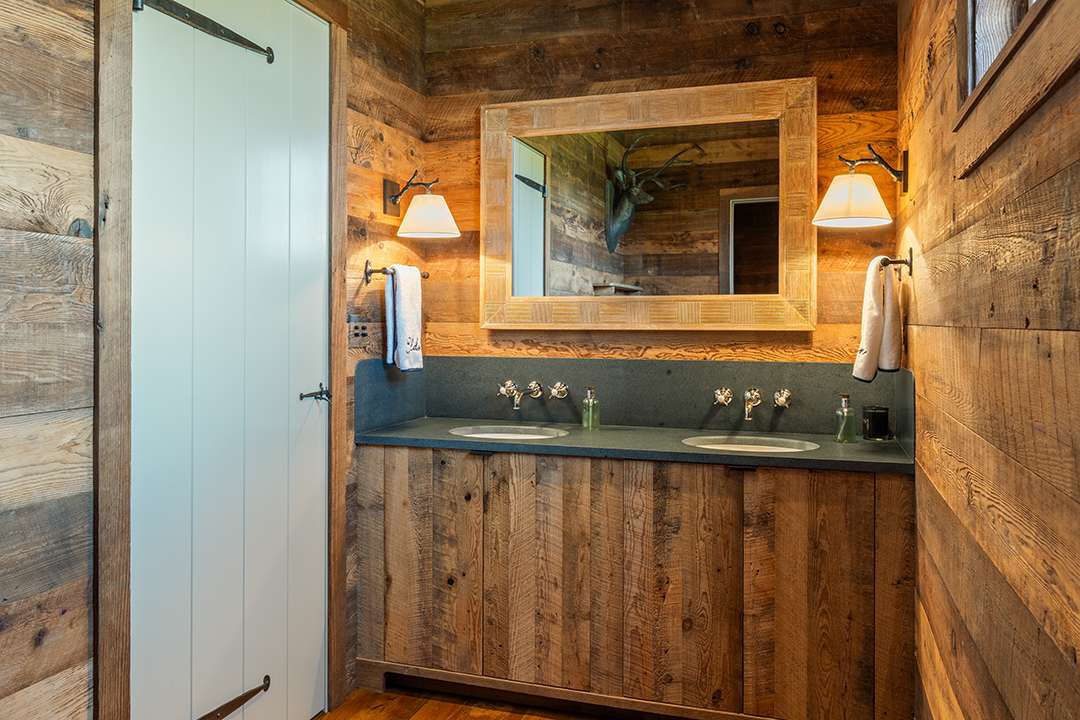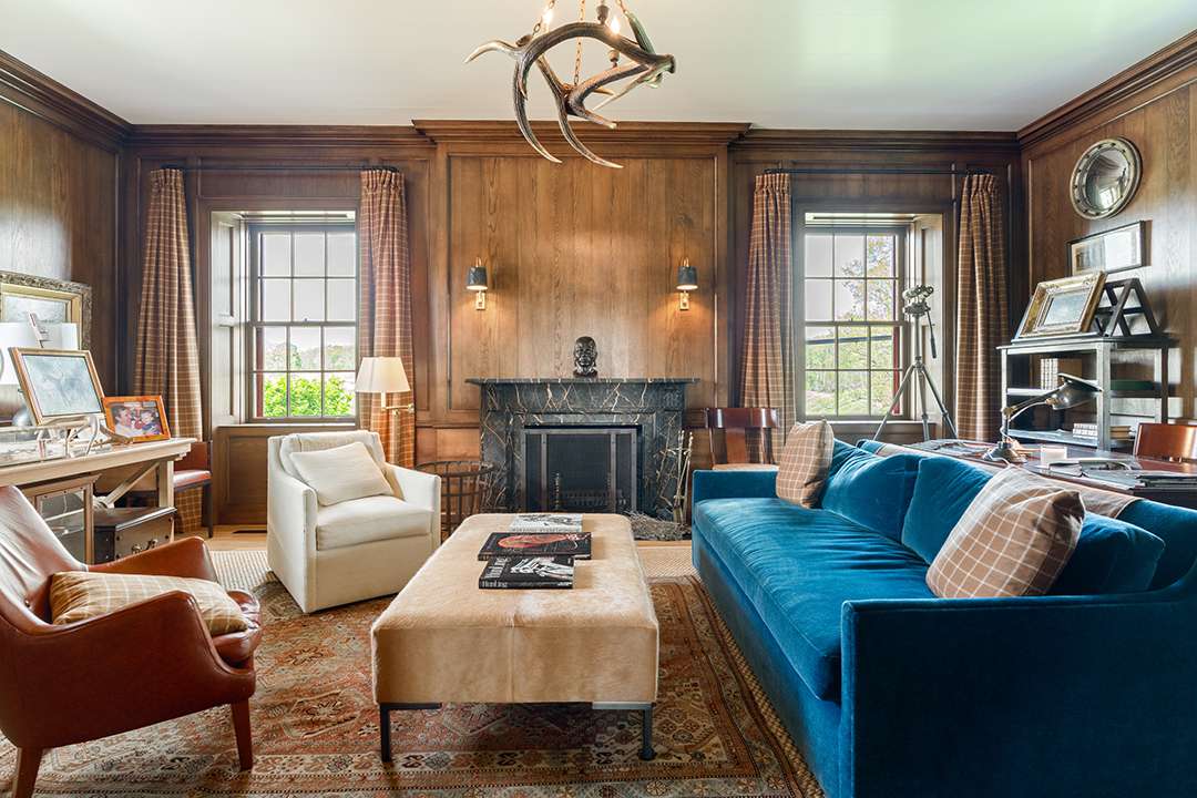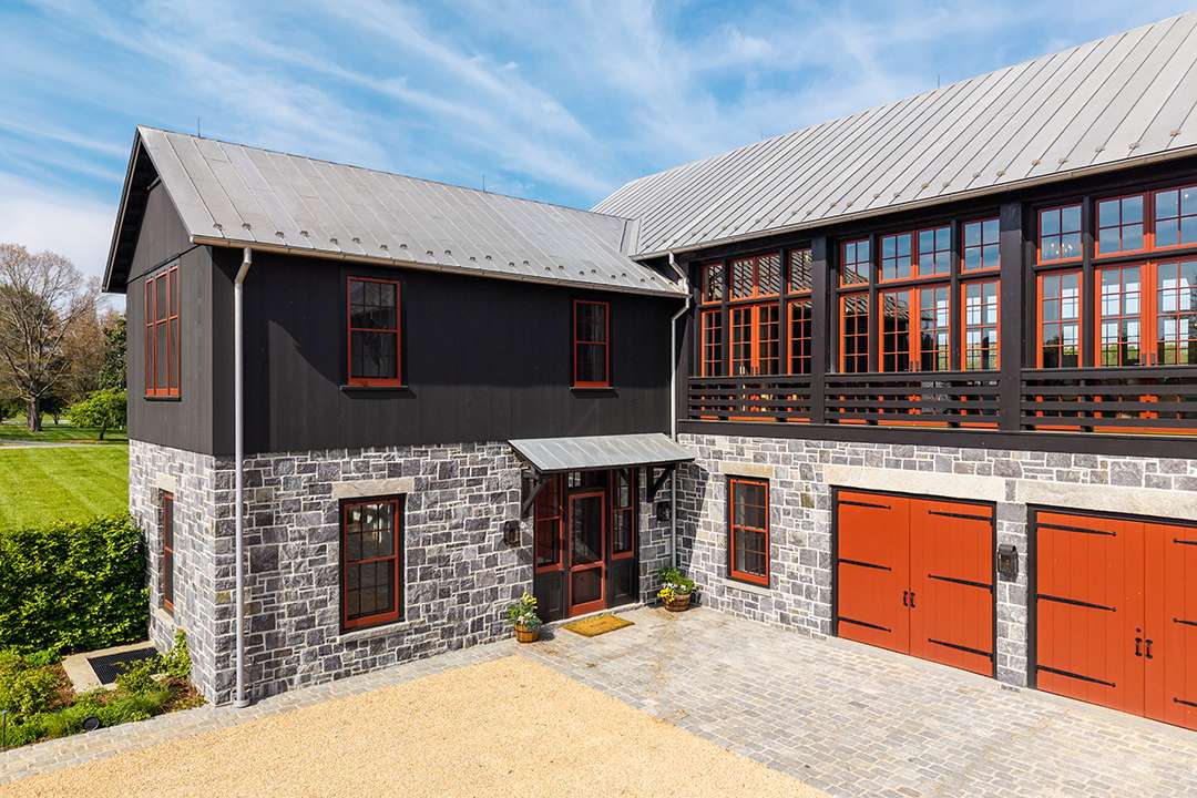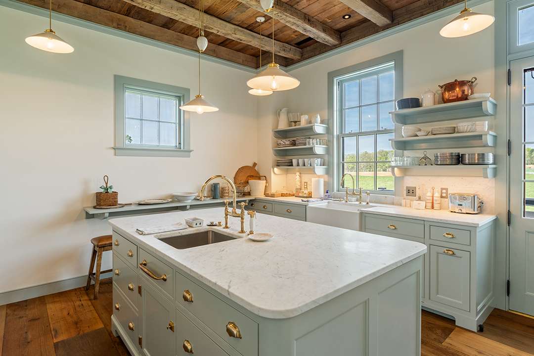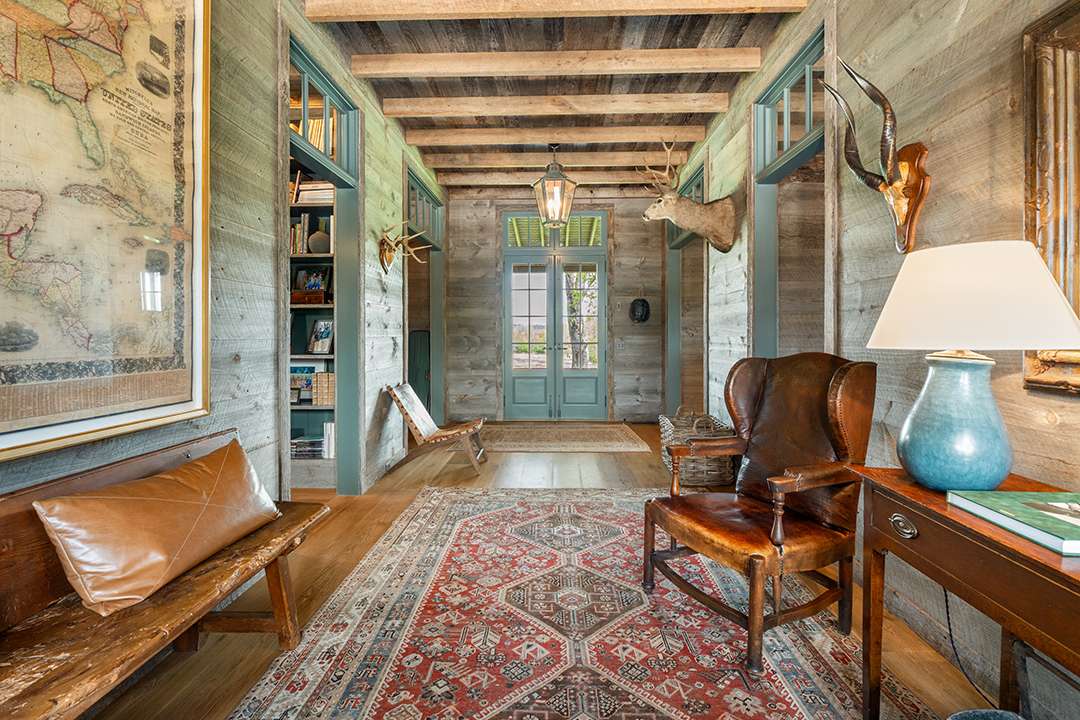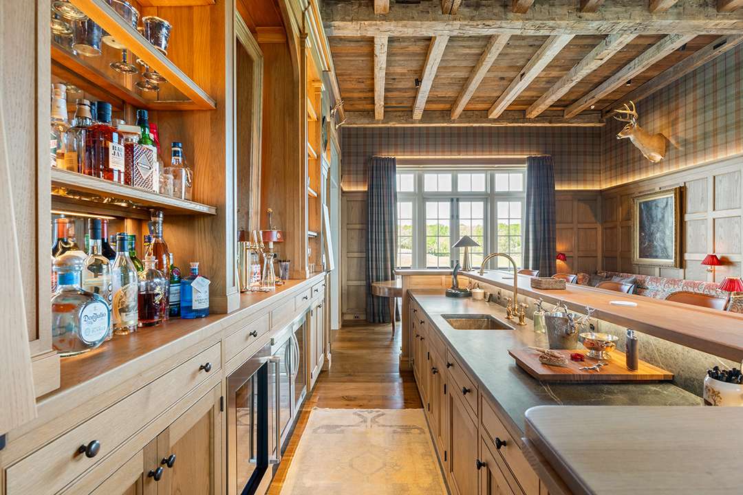 The newest, and perhaps most striking, addition on site is Eldon Lodge, which was completed in 2024. Showcasing reclaimed timber and Roxbury granite, it’s the crown jewel of the property for impressing and gathering on a large scale. The grand hall with exposed wood, glamorous yet cozy wet bar with sleek lighting, and dreamy kitchen dressed in light green are practically begging for holiday parties. Meanwhile, a structure known as the “Eldon Office” sits nearby and serves as a chic hideaway for peaceful moments in solitude.