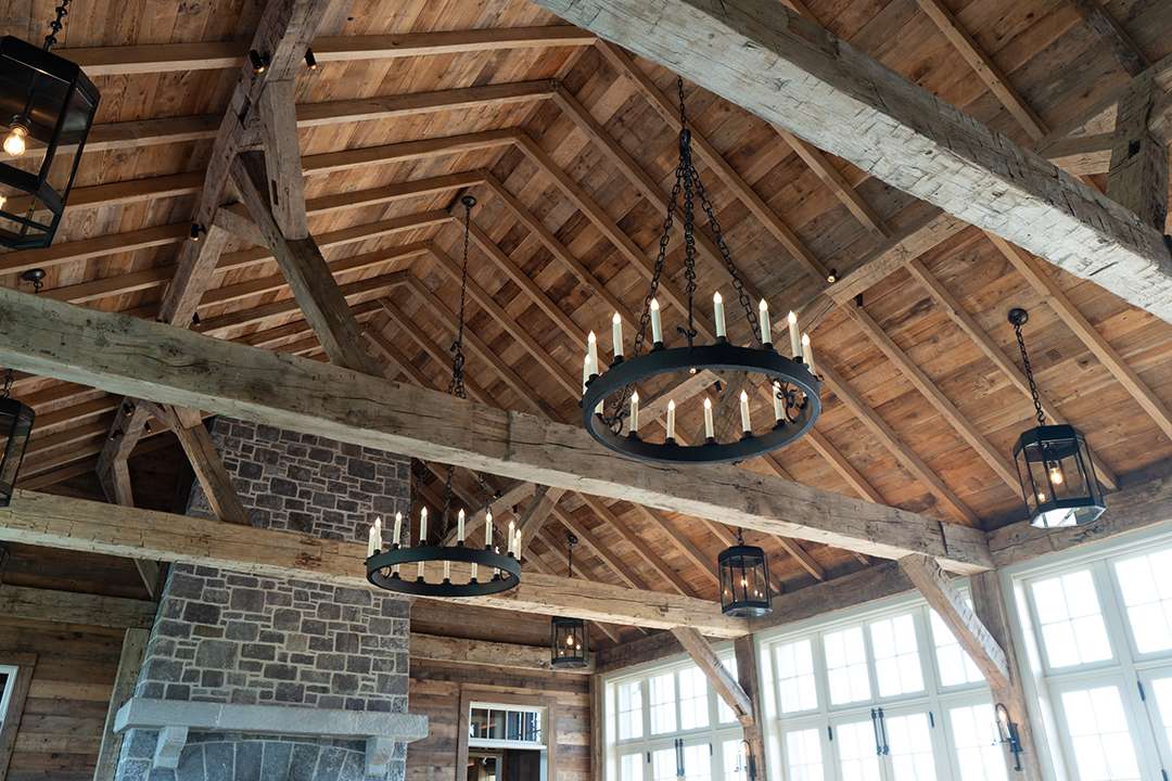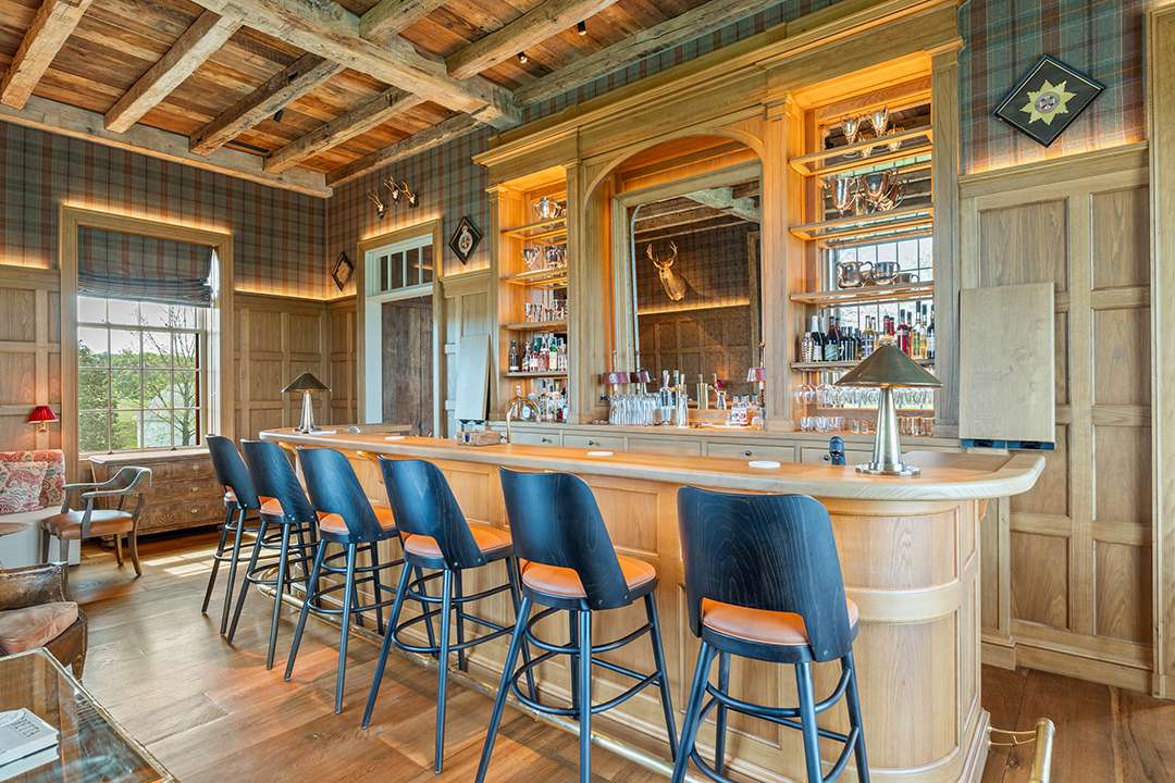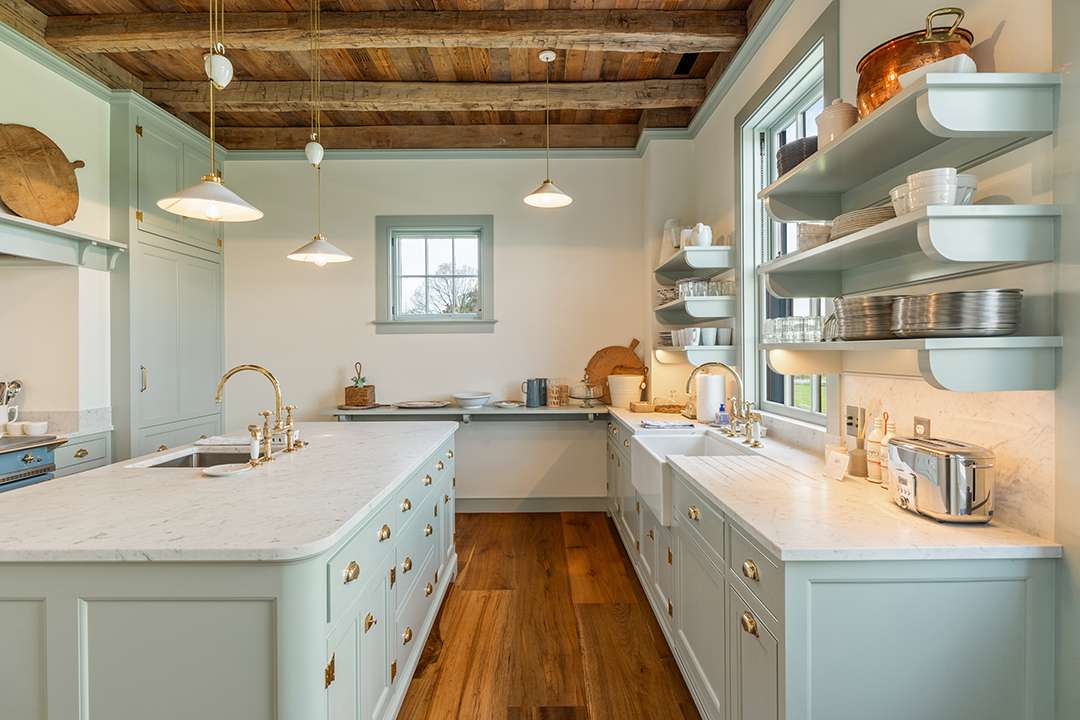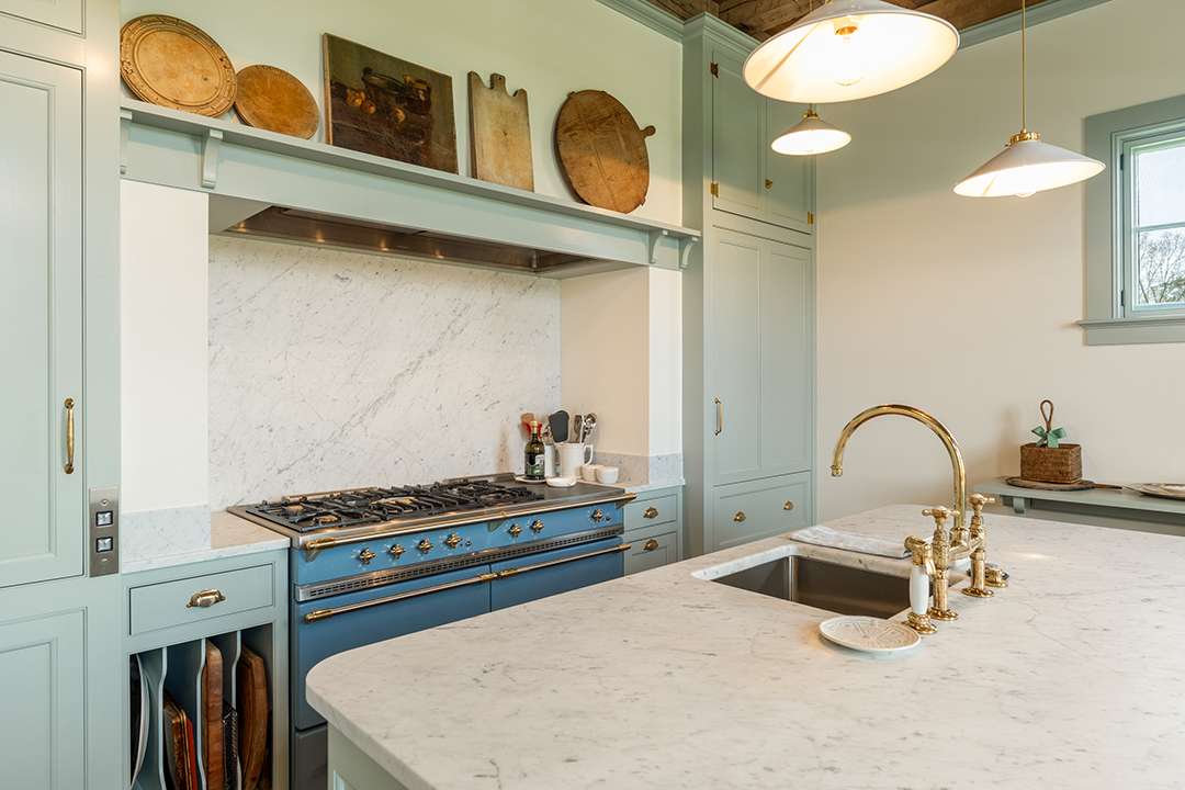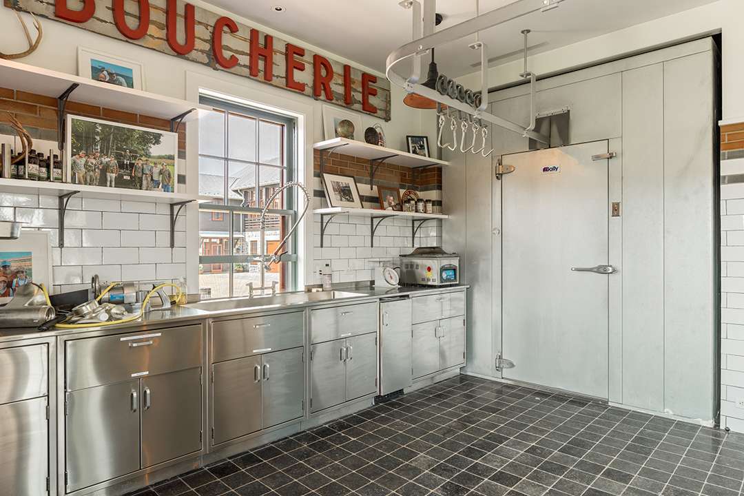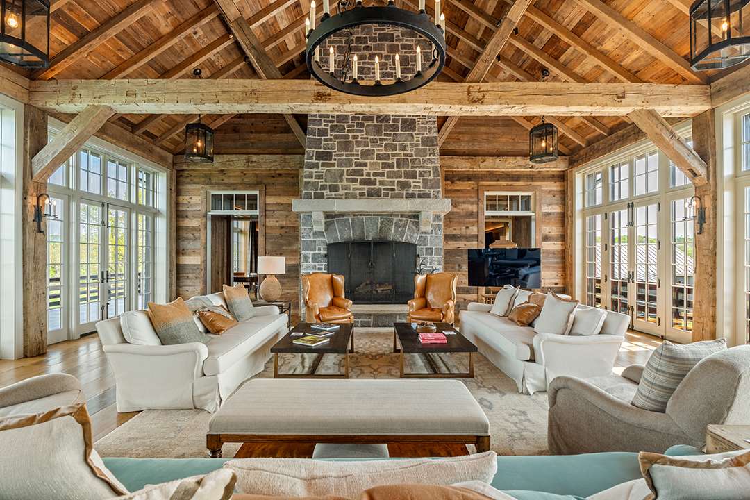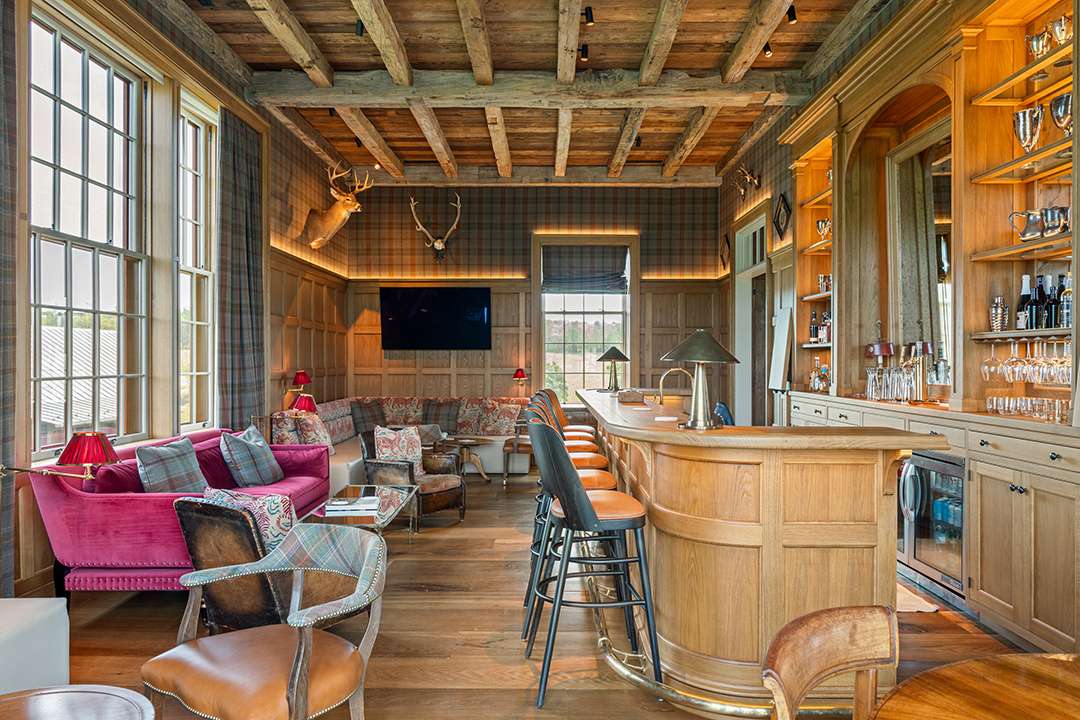 The newest, and perhaps most striking, addition on site is Eldon Lodge, which was completed in 2024. Showcasing reclaimed timber and Roxbury granite, it’s the crown jewel of the property for impressing and gathering on a large scale. The grand hall with exposed wood, glamorous yet cozy wet bar with sleek lighting, and dreamy kitchen dressed in light green are practically begging for holiday parties. Meanwhile, a structure known as the “Eldon Office” sits nearby and serves as a chic hideaway for peaceful moments in solitude.