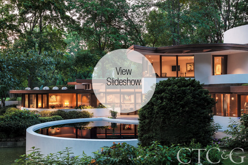 Gelbin, who designed a number of houses in Connecticut, developed the design of this home in close collaboration with the original client, a Swiss engineer who spared no expense with structure and materials. The millwork and hardware were all imported (Sapele mahogany from Africa, handcrafted brass hardware from Denmark). The house is full of curved mahogany cabinetry and built-ins, circular skylights and views of a lush landscape that includes the largest gingko in Connecticut and a crape myrtle that’s carefully wrapped every year to survive the New England winter.