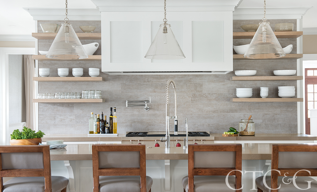 The real scene stealer, though, is smack in the middle of the the house: the kitchen. The husband is in the food industry, so Sanders and Hay were charged with creating it to his exact specifications. “We started with the kitchen in the middle of the space, like an open-kitchen restaurant, and radiated out from there. It’s one of the most interesting kitchens we’ve done,” says Sanders. Adds Hay, “The husband was very specific. Open shelves were a mandate. The challenge was how to make them look interesting and attractive when a room is open to the rest of the house.” Hay specified cerused oak shelves and porcelain tile that looks like wood. “It has that modern farmhouse feel, while being durable and keeping that light-as-air feeling.”