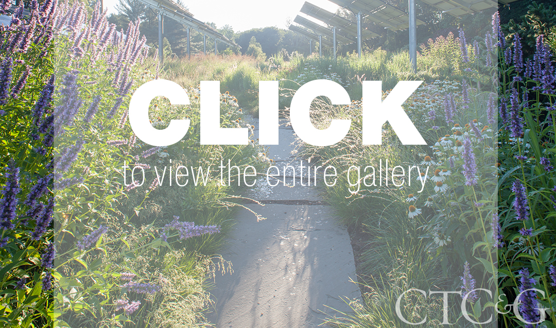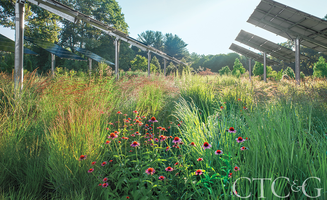 Tapped to design a garden encompassing 300 raised solar panels, the first thing landscape designer Brian Grubb of Providence Landscapes did was tackle the prevailing negative attitude toward the projections more commonly associated with rooftops than flora and fauna. “There is an overwhelming sense that solar panels are ugly and they need to be hidden,” says Grubb, who ultimately adopted a metaphorical approach that likened the panels to trees in an orchard. “With fruit trees, your currency is apples, and in this case our product was kilowatts. But more than just something to reduce electricity, I wanted to create a statement space you could move through and spend time in.”
