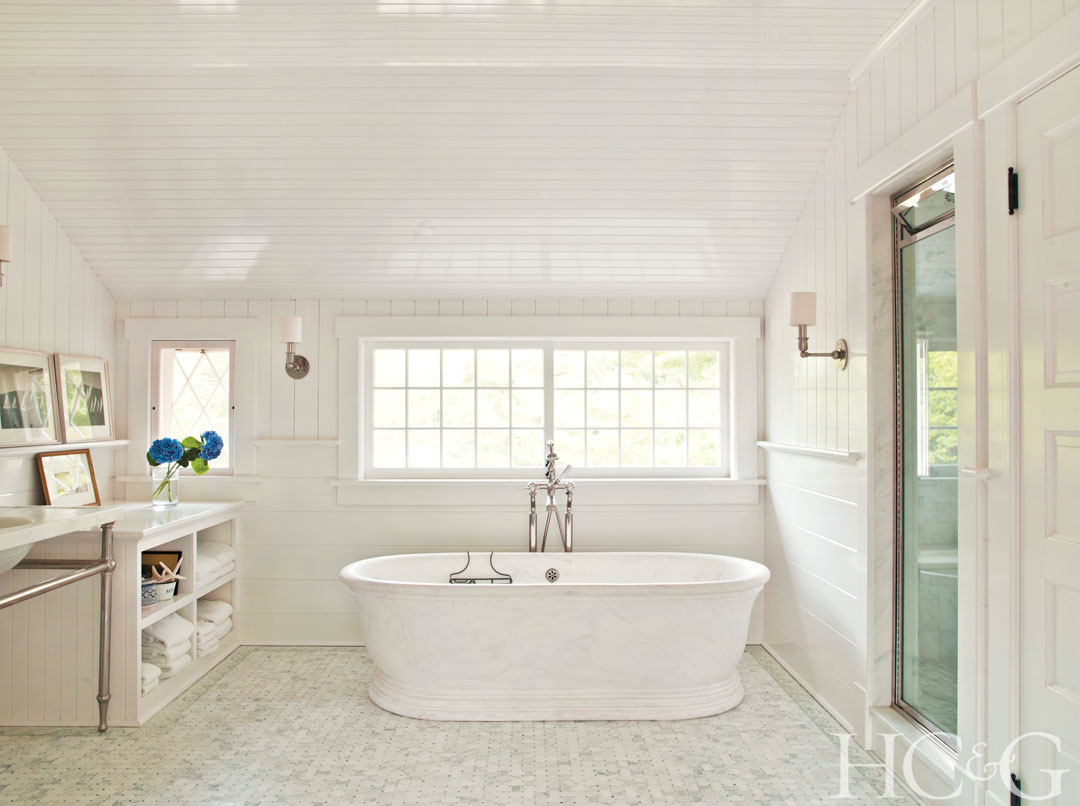 In the new master bathroom, a tub and washbasin from Urban Archaeology complement the meticulously paneled walls and ceiling.