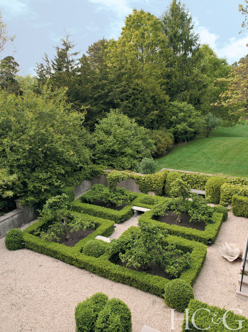 Neatly clipped boxwood hedges surround four mature apple trees in a small garden abutting the house.