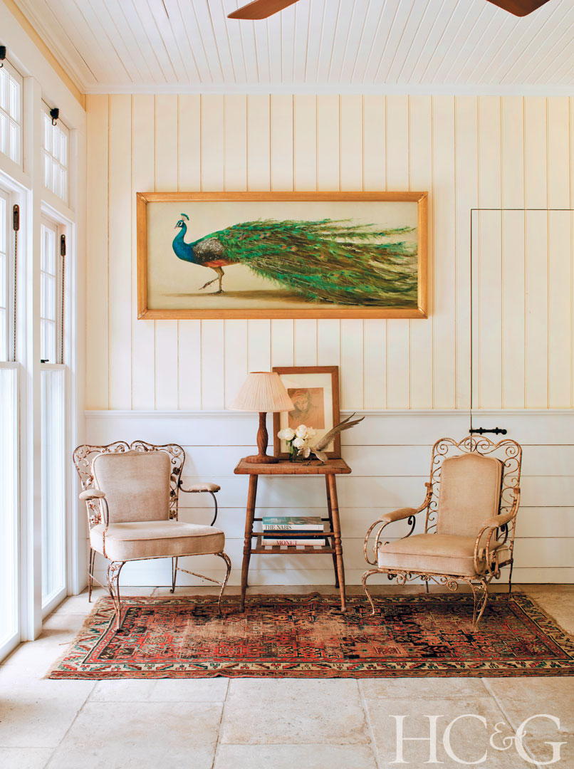 In a sitting area, chairs found at a garage sale have been covered in crushed velvet. The peacock painting is by Beth Rundquist.