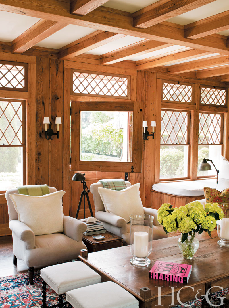 The new family room features reclaimed chestnut walls and a period-style Dutch door.