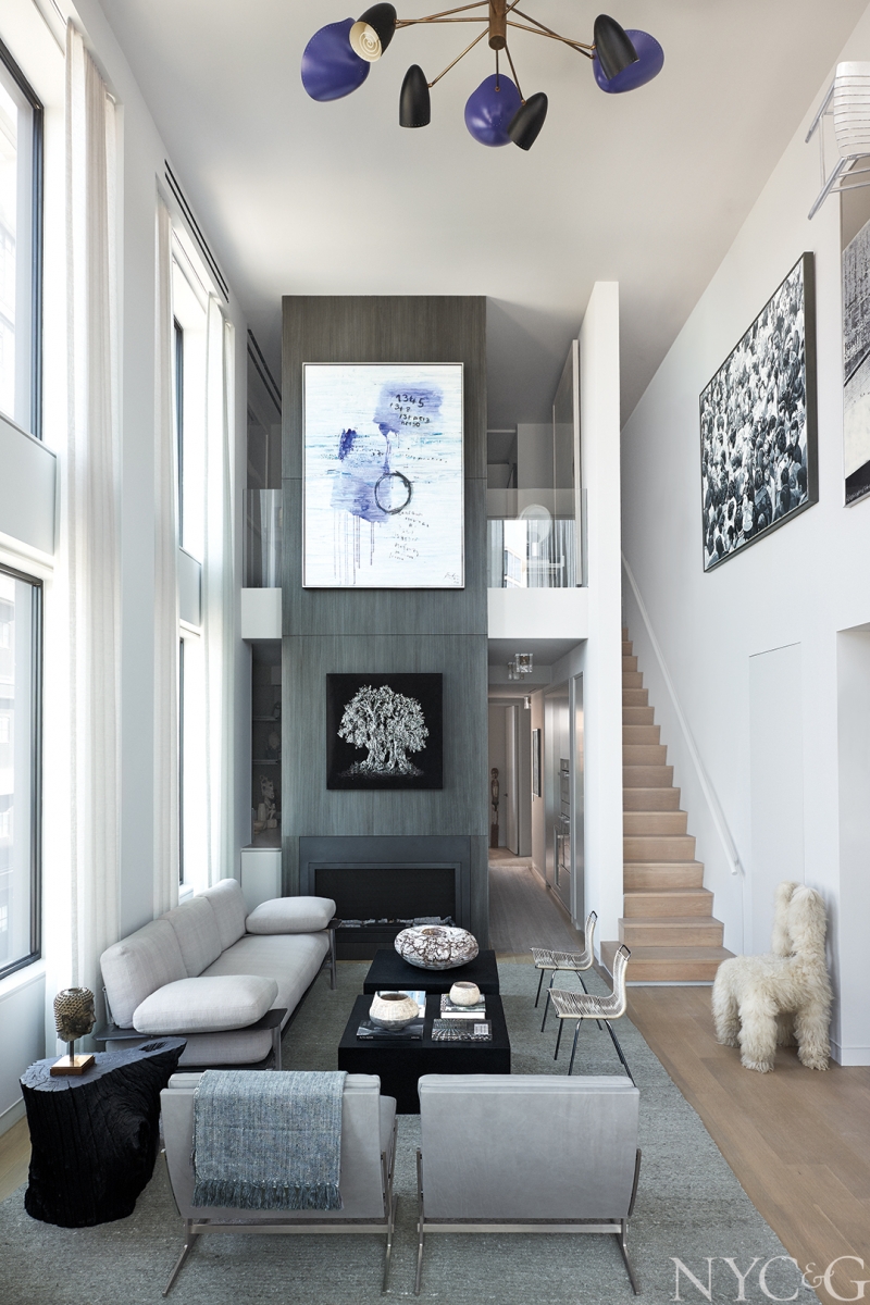 When Silver’s client purchased the apartment, it was a raw, unembellished shell. The decorator made a dramatic and crucial structural change, erecting a floor-to-ceiling wall abutting a narrow staircase that leads to the master suite and office. Adding to the drama and further delineating the interiors: a handsome chimney surround made of striated oak, which partially shields the kitchen. “By incorporating these changes, and also putting in glass half walls on the second level, we created distinct environments both upstairs and downstairs,” says Silver. “The apartment is very tall and narrow, and I intentionally devised separate living areas that wouldn’t feel claustrophobic. Now there’s a fluidity in how everything links up.”