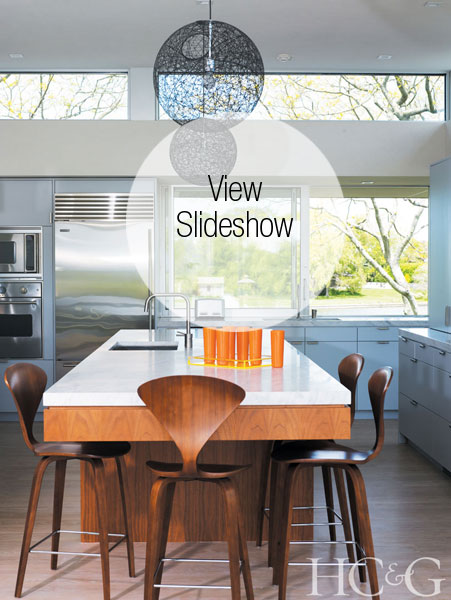 The modern great room and kitchen occupies a one-story pavilion with 12-foot ceilings and a clerestory that splashes the interiors with sunlight. Overhangs shade the big new sliding glass doors below and, just off the kitchen, wrap around the corner of the building to shelter a dining porch under a thrusting 14-foot cantilevered roof. “In the morning, you can hear the swans swimming in the pond and birds in the trees,” Lomont notes.