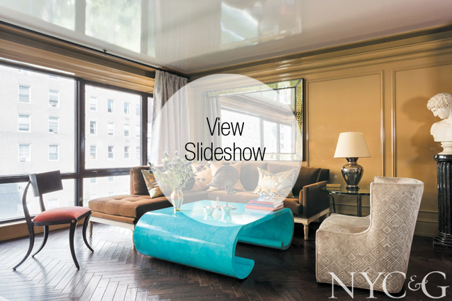 Following in his mentor’s formidable footsteps, Kedigian fashioned a tour de force in Franklin’s dining area, a cocoon-like corner hugged by built-in bookcases with turquoise backing and an old-world air, dramatically separated from the living room by a heavy, theatrical curtain. But the pièce de résistance is what Kedigian terms “the foreign element,” the unexpected component that turns a room on its head—in this case, the linen-covered cocktail table in the living room, carved from a single piece of wood and painted a bright turquoise. In an apartment laden with treasures, it’s most certainly the crown jewel. “I wanted my home to be warm and welcoming without it looking outdated ten years from now,” Franklin enthuses. “It was an amazing transformation, but not what I envisioned at all. It’s so much better.”