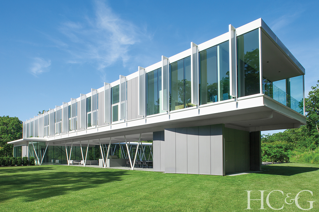 Matlock employed several strategies to ensure that the 8,500-square-foot house rests lightly on the site, giving equal importance to the structure and the landscape. “We built models for three schemes,” the architect recounts, “and it became clear that this approach was best for a family that loves to embrace the outdoors.” The extensive glazing creates a transparent envelope allowing light in and views out in every direction. The elevated family wing and the overhang on the courtyard side of the public wing are supported by white-painted V-shaped steel columns, their shape an abstract interpretation of the trees surrounding the site. Their slenderness suggests a lightness to the structure they support.