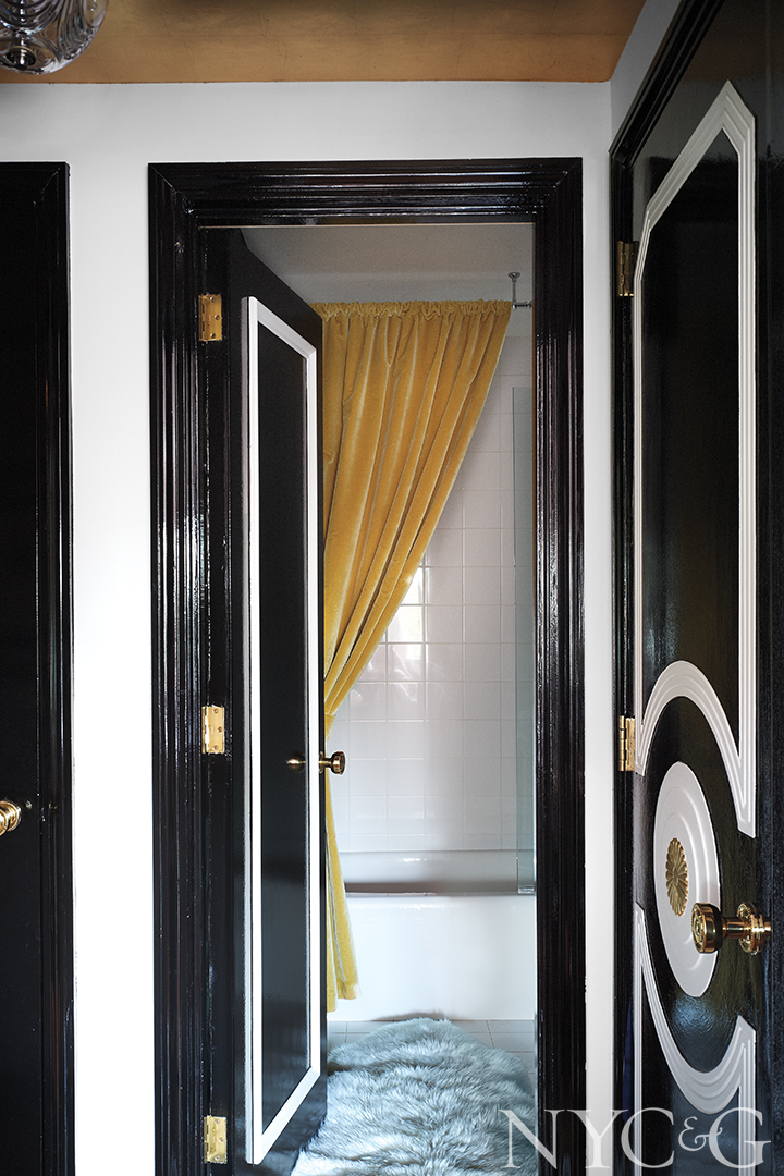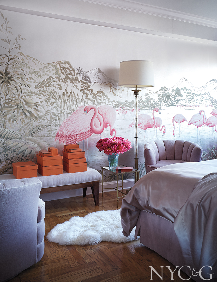 “We added moldings and trim, lacquered the doors black, and applied a 24-karat-gold-leaf pinstripe just beneath the ceiling molding to pick up the gorgeous light filtering through the windows,” recounts the designer, who also enveloped the living room walls in a creamy suede, drenched the dining room in high-gloss emerald-green lacquer, and installed a hand-painted de Gournay wallpaper in the bedroom, replete with flocks of pink flamingos. “Deco design can be robust and even masculine at times,” Foster notes, “but I wanted my bedroom to be as romantic and feminine as possible. So when Nicole posted an image of the de Gournay wallpaper on Instagram, I sent her a text saying, ‘This is mine,’ to which she responded, ‘Done.’ It took eight months to have it made, and it was worth the wait.”