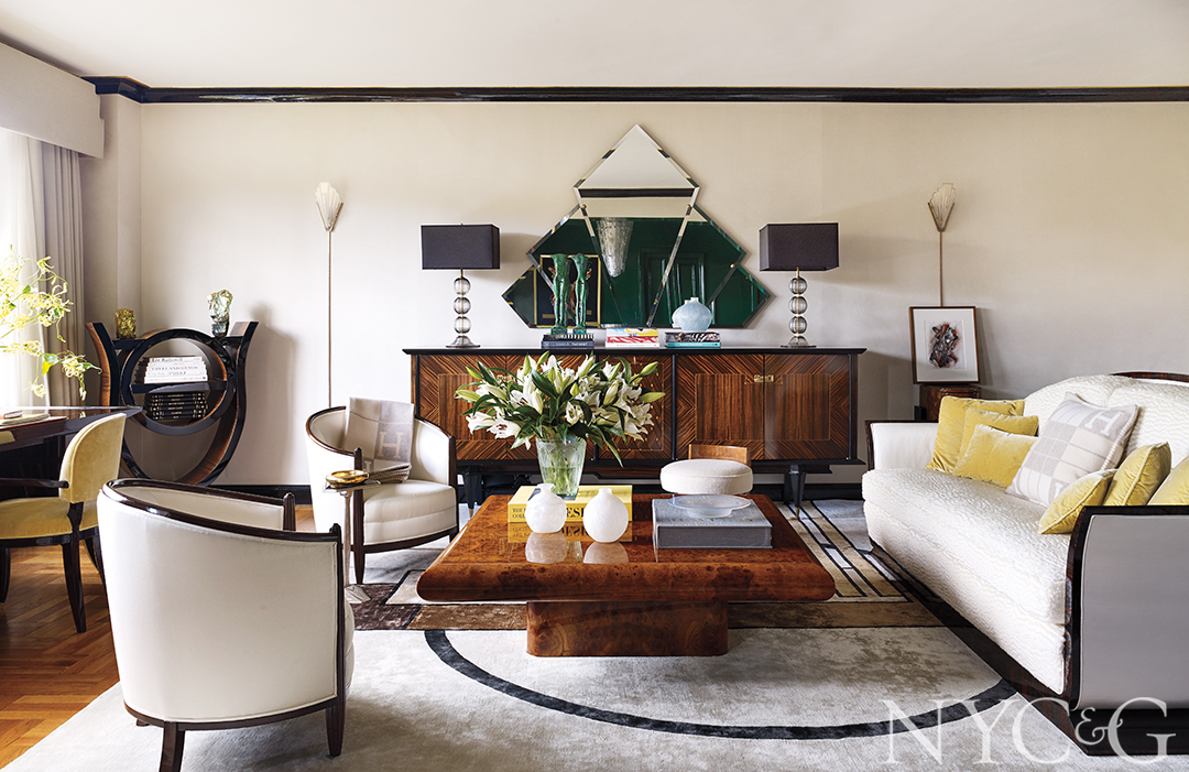 The women’s “creative love affair,” as Fuller calls it, reached an apotheosis when Foster asked her new friend to decorate her Fifth Avenue pied-à-terre, which doubles as a showroom space for the bespoke pieces she designs for private clients. As it turned out, the inspiration for both the engagement ring and the dwelling sprang from the same source. “We’re both in love with the Art Deco period,” says Foster, a native of East Hampton who spends much of her time in Los Angeles and London, in addition to New York. “It was an over-the-top glamorous time.”
