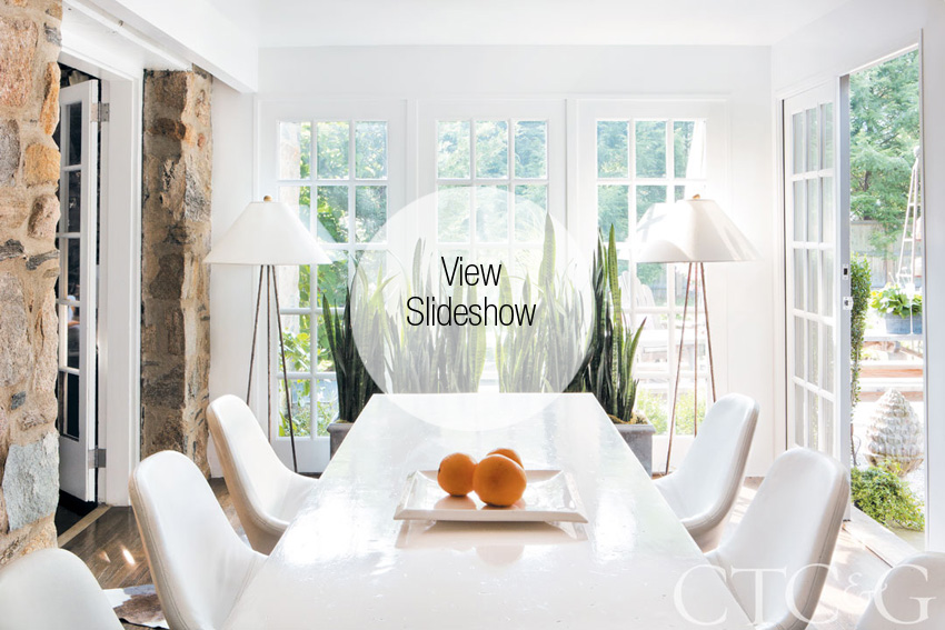 Her own home on two acres in Lyme stands as testimony to that belief. From the Carrara marble kitchen counters to the sitting room sofas topped with faux leather (faux being mandatory for someone who shares her home with four poodles and a Chihuahua), it’s white that grounds the interior landscape and sets the tone for the entire house.